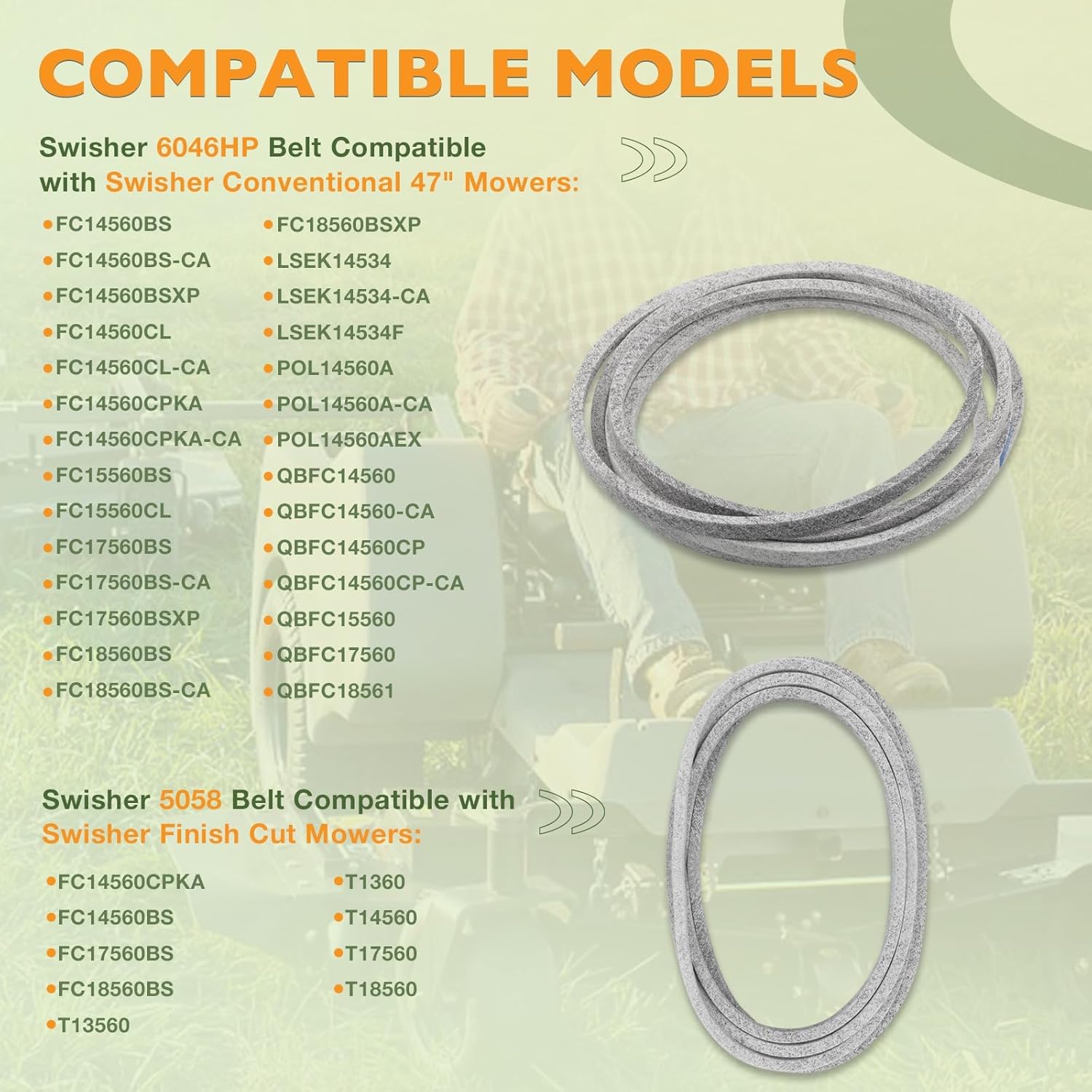 Package Contains 3 x 9037 Lawn Mower Blade 1 x 5058 Lawn Mower Belt 1 x 6046 Lawn Mower Belt Blade Fit For Replaces for 9037, 9004, 20186, 3293, Oregon 91-050. Compatible with Swisher's 60 in finish cut mowers FC14560BS, FC17560BS, FC18560BS, T1260, T1360, T1460, T13560, T14560, T14560B, T17560, T18560. 5058 Belt Fit For The V-Blade compatible with Swisher FC14560CPKA, FC14560BS, FC17560BS, FC18560BS, T13560, T1360, T14560, T17560, T18560 finish cut mower. 6046 Belt Fit For The Mower Blade compatible with Swisher FC14560BS, FC14560BS-CA, FC14560BSXP, FC14560CL, FC14560CL-CA, FC14560CPKA, FC14560CPKA-CA, FC15560BS, FC15560CL, FC17560BS, FC17560BS-CA, FC17560BSXP, FC18560BS, FC18560BS-CA, FC18560BSXP, LSEK14534, LSEK14534-CA, LSEK14534F, POL14560A, POL14560A-CA, POL14560AEX, QBFC14560, QBFC14560-CA, QBFC14560CP, QBFC14560CP-CA, QBFC15560, QBFC17560, QBFC18561. Note This blade and belt is NOT OEM blade and belt. The OEM number is just for your help in looking for the blade and belt you need!