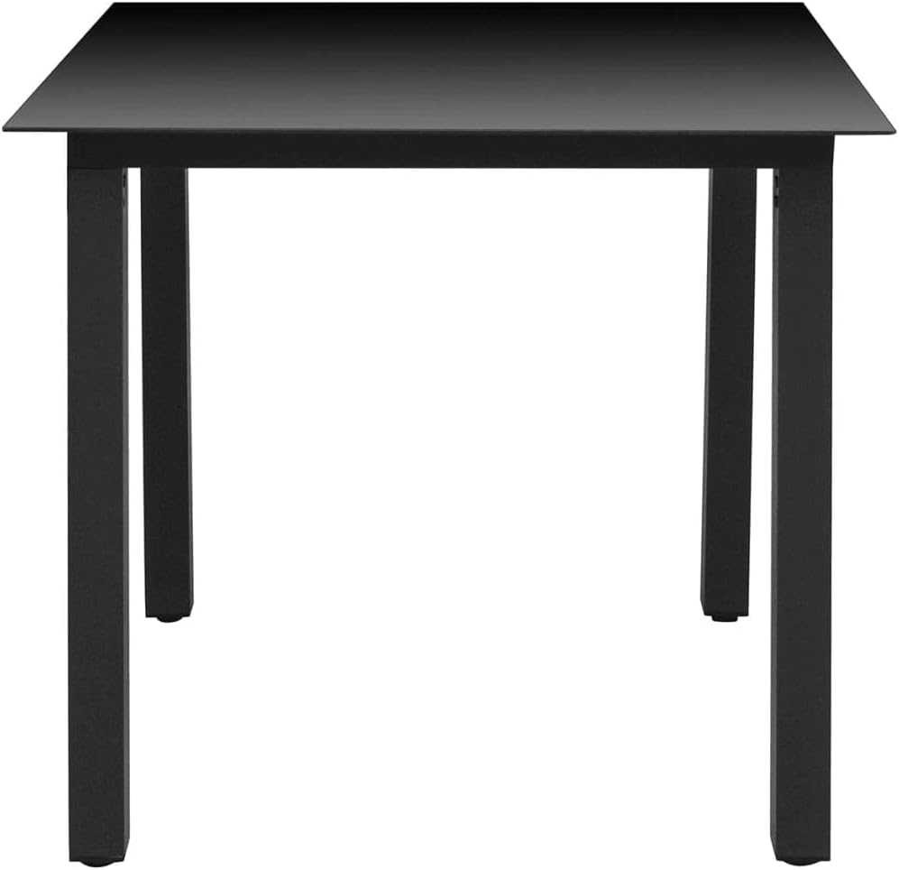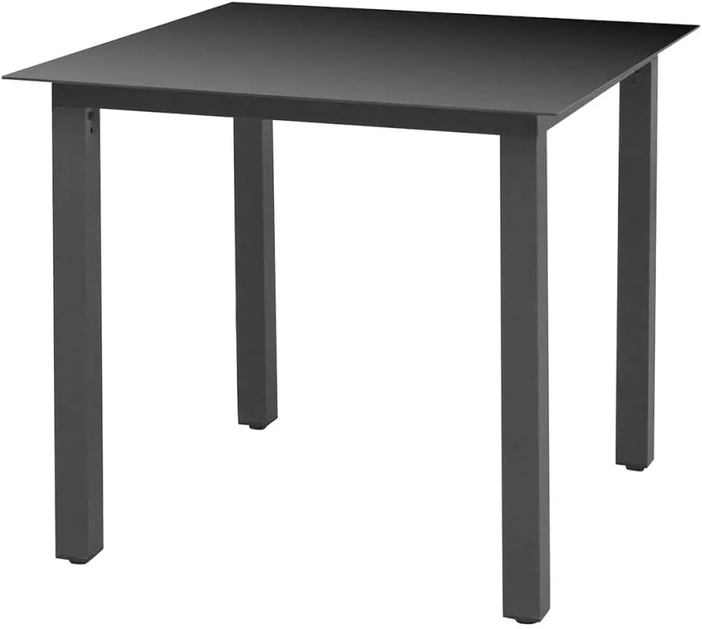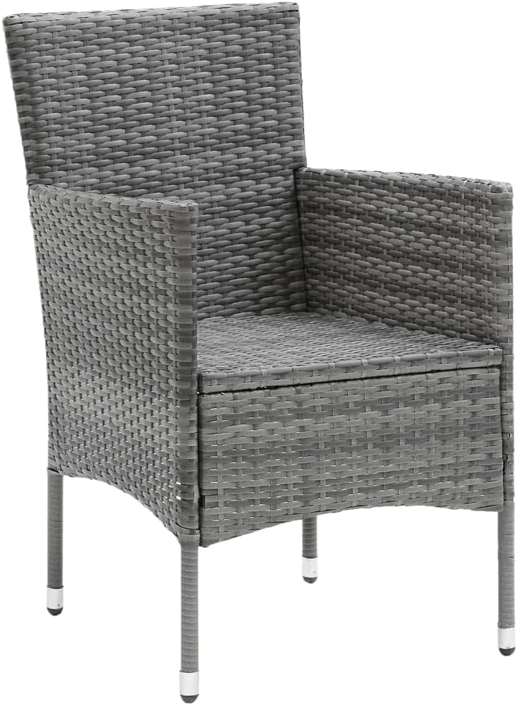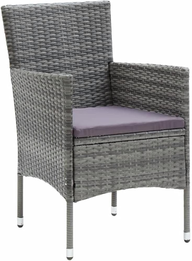 This garden dining set is a perfect combination of style and functionality and is meant to be the focal point of your garden, balcony or patio.Sturdy steel frame wrapped with weather-resistant PE rattan, the garden chairs are rust proof, providing years of quality relaxation. The outdoor table features a glass tabletop with simple lines, which is easy to clean and suitable for outdoor use. The aluminum frame also ensures stability and sturdiness. Additionally, the thickly padded cushions provide ultimate comfort during your sitting time. This patio dining set is easy to move with the lightweight construction.Note: In order to extend the life of your outdoor furniture, we recommend you to clean it regularly and do not leave it outdoors without protection unnecessarily.Clean: Use a mild soap solution.Storing: If possible, store in a cool, dry place indoors. If the product is stored outdoors, protect it with a waterproof cover. Wipe and dry the excess water or snow from flat surfaces after a rain or snowfall. Allow sufficient air circulation to avoid moisture-related damage.TableColor: BlackMaterial: Glass, aluminumDimensions: 31.5" x 31.5" x 29.1" (L x W x H)ChairPE rattan color: GrayCushion color: Dark grayMaterial: PE rattan, steel, fabric (100% polyester)Dimensions: 20.9" x 22.8" x 33.1" (W x D x H)Seat size: 15.4"/17.5" x 18.1" (W x D)Seat height from the ground: 16.5"Armrest height from the ground: 24.4"/25.6"Seat cushion thickness: 1.6"Assembly required: YesDelivery contains:1 x Table2 x Chair2 x Seat cushion