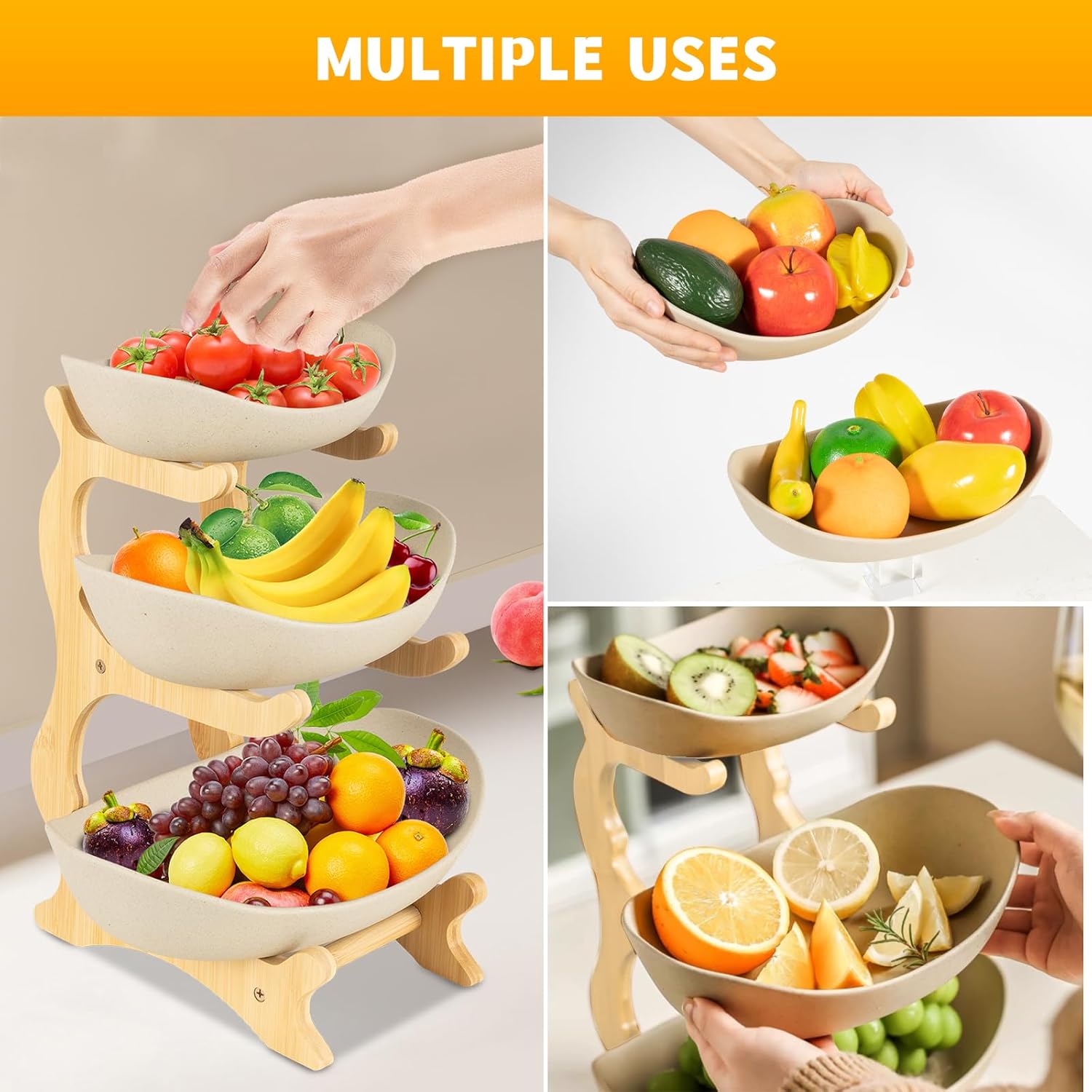 Bring elegance and organization to your kitchen or dining space with this 3 Tier Fruit Basket for Countertop. Designed to elevate both form and function, this fruit bowl set features three oval ceramic trays in warm, earthy tones supported by a polished bamboo frame. The stepped vertical layout maximizes counter space while adding a clean and modern touch to your home. Whether you use it to store fruits, snacks, condiments, or decorative items, it keeps everything visible and easily accessible. Ideal for daily use or special gatherings, this tiered organizer transforms your counter into a tidy, stylish display.PRODUCT KEY FEATURESElegant Design: Oval ceramic trays with natural bamboo add a warm, organic accent to your space.Food-Safe and Heat-Resistant: All trays are made of lead-free ceramic and are safe for use in the oven, microwave, and freezer.Space-Saving Vertical Structure: Designed to fit snugly in kitchen corners or tight countertops.Multi-Functional Use: Trays can be removed and used separately as serving dishes.Easy Cleaning: Dishwasher safe ceramic; frame can be wiped clean.APPLICATIONSPerfect for storing and displaying fruits, vegetables, desserts, sushi, candy, or party snacks. Also great for bathroom toiletries, small toys, makeup items, or as a centerpiece for events like weddings, housewarmings, birthdays, and more.SPECIFICATIONSMaterial: Bamboo, Lead-Free CeramicColor: Brown Frame + Earth-Tone TraysShape: OvalFrame Size: 5.51 × 8.66 × 12.6 inProduct Net Weight: 4.52 lbsProduct Gross Weight: 4.96 lbsPackage Size: 13 × 9.44 × 5.9 inAssembly Required: Yes (all accessories included)TRAYS: Small Tray: 7.87 × 5.9 × 1.96 in Medium Tray: 9.05 × 6.7 × 2.36 in Large Tray: 10.82 × 7.48 × 2.56 inPACKAGE INCLUDES1 × 3-Tier Fruit Bowl (Ceramic Trays + Bamboo Stand)1 × English Installation GuideAll Screws and Assembly AccessoriesNOTESAvoid placing the bamboo frame in direct sunlight or soaking it in water.As bamboo is a natural material, slight color variations or grain patterns may occur. These do not affect function.Whether you're looking to streamline your kitchen or create an eye-catching fruit display for guests, this 3-tier ceramic fruit bowl delivers elegance, functionality, and space-saving convenience. Make it a centerpiece of your countertop today!
