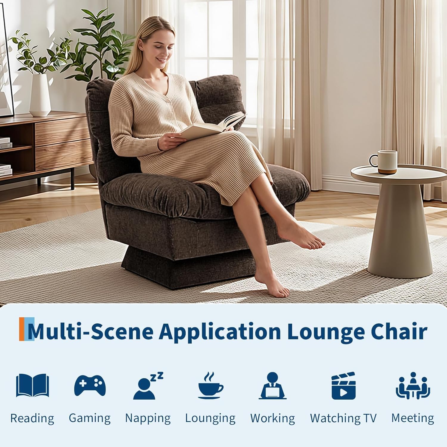 Searching for a modern swivel accent chair that delivers both style and comfort? Imagine sinking into plush chenille fabric and enjoying effortless 360° rotation every time you relax, read, or unwind at home.Highlights at a Glance:- Smooth 360° swivel function for flexible movement in any space- Plush chenille fabric and high-density foam cushion offer lasting comfort- Deep ergonomic seat and supportive backrest for full-body relaxation- Versatile accent chair, perfect for living room, bedroom, office, or apartment- Quick and easy assembly lets you enjoy your new chair in minutesSpecifications:Product: Swivel Accent ChairDimensions: 35.4 x 34.6 x 34.8 inWeight Capacity: 300 LBMaterial: Fabric, Wood and SpongePlease Note:Please follow the included instructions and check that all parts are labeled before starting assembly.Do not overtighten screws during assembly to prevent damage to the frame.Packing List:1 x Living room Chair1 x Hardware Pack1 x Assembly Instruction