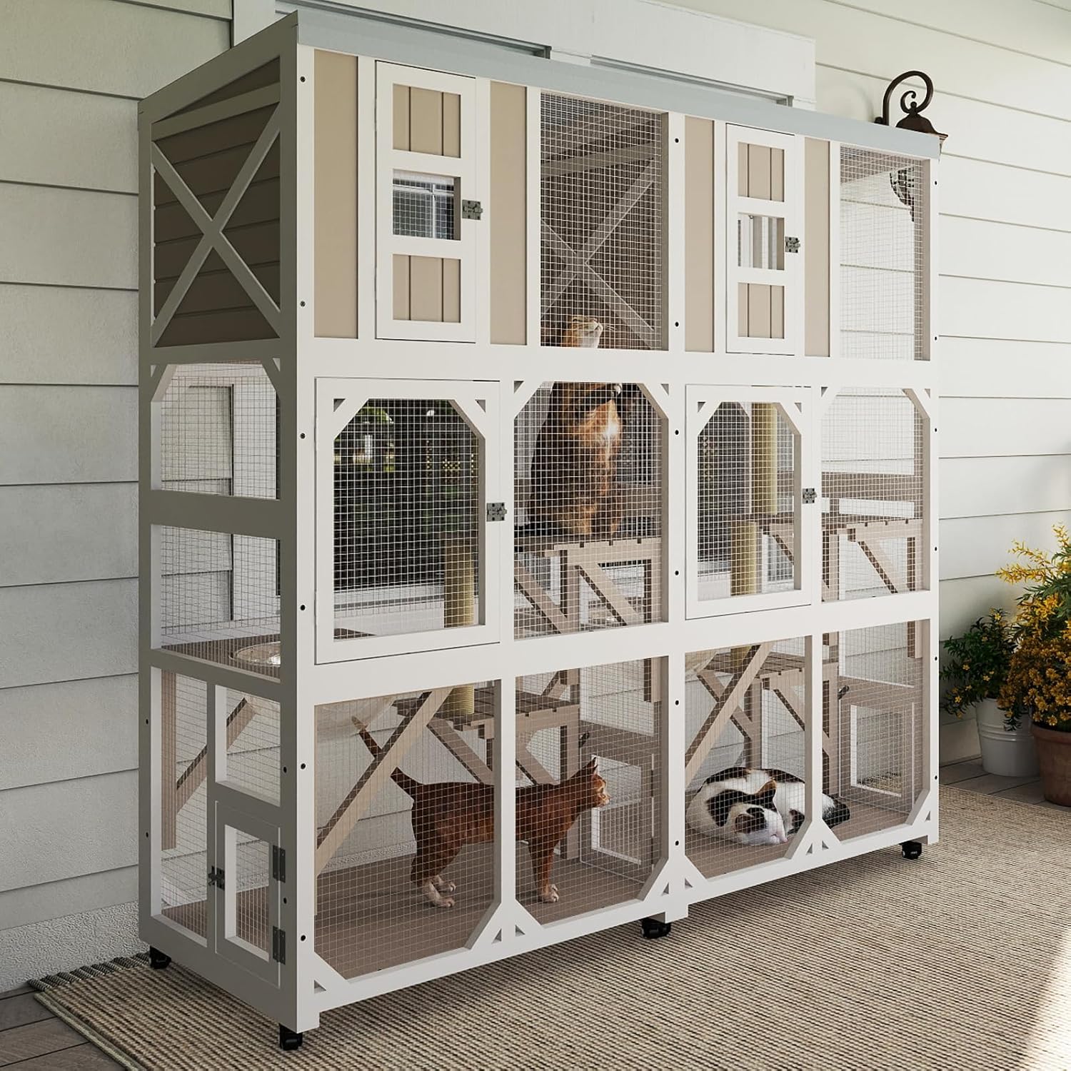 • 【Mobile & Flexible】 Equipped with 4 rolling casters, this cat house can be moved effortlessly from indoors to outdoors. Lockable wheels keep it steady and secure in place