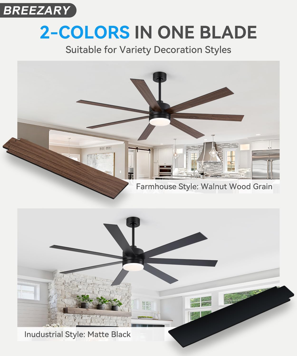 72 Inch Large Ceiling Fans with Led Lights Remote Control, Dual Finish 7 Reversible Blades, 3 Color Led Light Fandelier, Industrial Black Ceiling Fans for Bedroom Product Features: Fan Type: Down Rod Mounting Ceiling Fan Light Style: Industrial/Modern/Farmhouse Material: Metal, Plywood, Acrylic Body Color: Black Number of Blades: 7 Blade Size: 27.56"L x3.94"W Material of Blades: Plywood Blade Colors: Black/Dark Walnut Blade Pitch: 12.5 degree Lighting: Led Light Motor Type: DC Motor Reversible Motor: Yes Motor Voltage: 120V/50-60HZ Motor Watts: 40W Speed: 6-Speed Max Motor Speeds: 155 RPM Max CFM: 5300 Down Rod Size Choice: 6"/12" Diameter of the Down Rod: 26.5mm/1 Inch Sloped Ceiling Compatible: Yes. ≤15° Low Noise: Yes Airflow Efficiency: 134 Product Dimensions and Weights: Installer's Choice's two-position mounting system allows for standard or lower mounting. Down Rod (short): 6 inches long Down Rod (long): 12 inches long Overall Size: 72 inches diameter x 15.4 inches height (6 in rod) Overall Size: 72 inches diameter x 21.4 inches height (12 in rod) Net Weight: 16.2 lb Package Includes: 1 x 72-Inch 7-Blade Black Ceiling Fan, 1 x Remote Control, 2 x Down Rods(6", 12"), 1 x User Manual