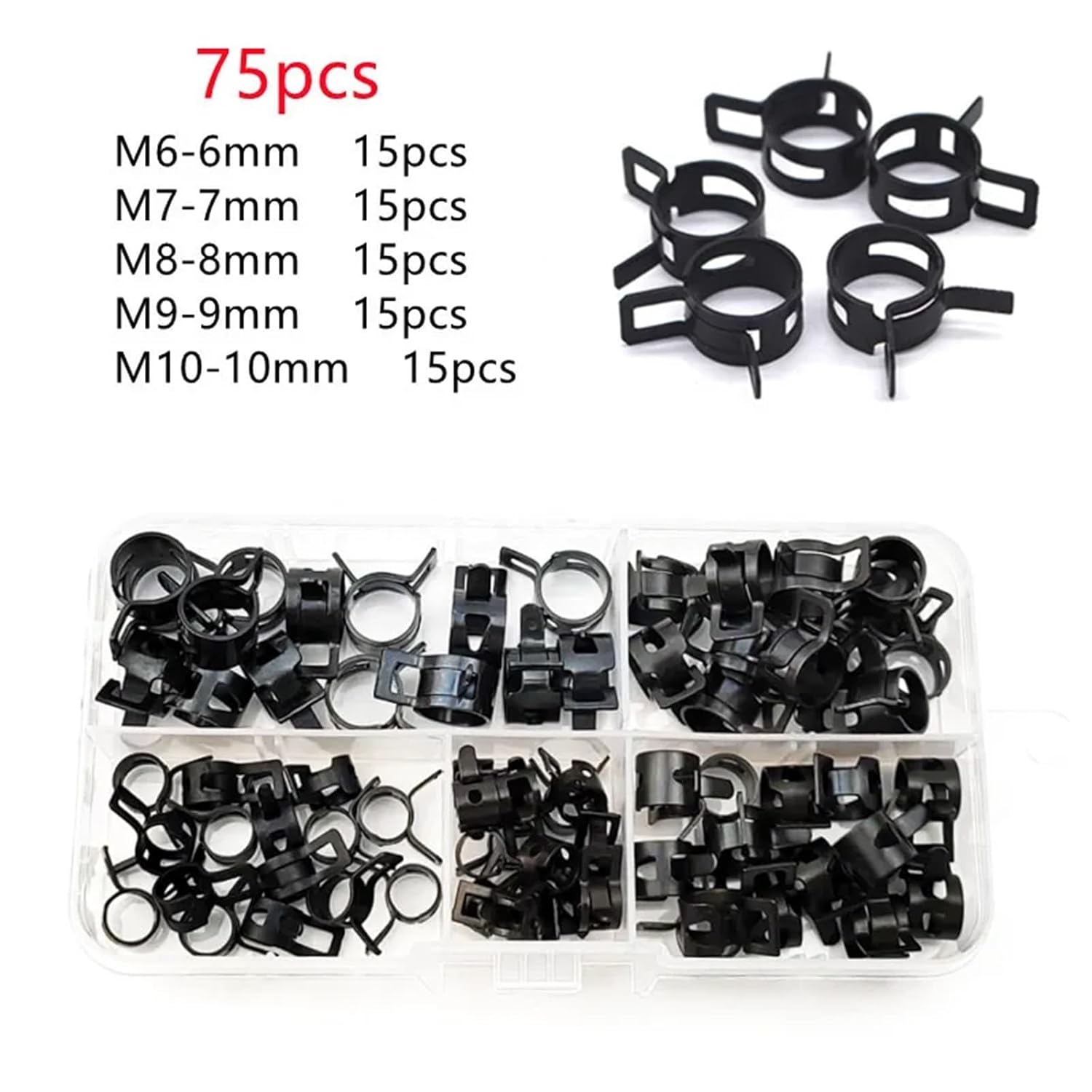 Hose ClampsMaterial: Iron, Packing Quantity: 75pcs, Packed in A Rugged Convenient Re-sealable Plastic Storage Case.The Package Contains 5 Sizes, Included: 6mm, 7mm, 8mm, 9mm, 10mmEasy to use, For Most Motorcycles, Boats, ATVs, SnowmobilesModel Number : M6 M7 M8 M9 M10Structure : Spring ClampDIY Supplies : MetalworkingMaterial : MetalUse : Pipe Clamp
