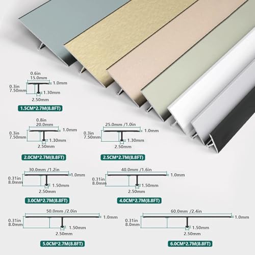 Introducing the 8.8FT Aluminum Floor Trat Strip, your ideal solut for smooth trats between various flo pes. Crafted from premium aluminum alloy, this T-molding trim effectively closes g between hardwood, tile, and carpet, ering a safe and even in any setting. Available in multiple widths (1.5CM, 2CM, 2.5CM, 3.0CM, 4CM, 5CM, and 6CM) and an array of slish colors like Black, Silver, White, Light Gray, Rose d, Champagne, and Gray, this trat strip not only cents your decor but also serves tial functali. Its lightweight design facilitates easy installat, making it suitable for DIY enthusiasts as well as professal contractors. Safe is paount, and the T-sd profile reduces tripping hazards, perfect for high-traffic areas in homes, offices, and retail envirnts. Whether updating your living room, renovating your worpace, or enhancing a commercial area, this trat strip adds a sk h while ering long-lasting durabili. Please note that the product includes only the items shown in the photos. Minor urement variats of 2-3% may occur due to manual urement, so we recommend checking the urement chart before making your pur. Color differences may also be present due to lighting and sn . For any inquiries or further assi, please contact us, and we will respond within 24 hours. Elevate your flo experience with our reliable aluminum floor trat strip and achieve a harmonious and ele space.