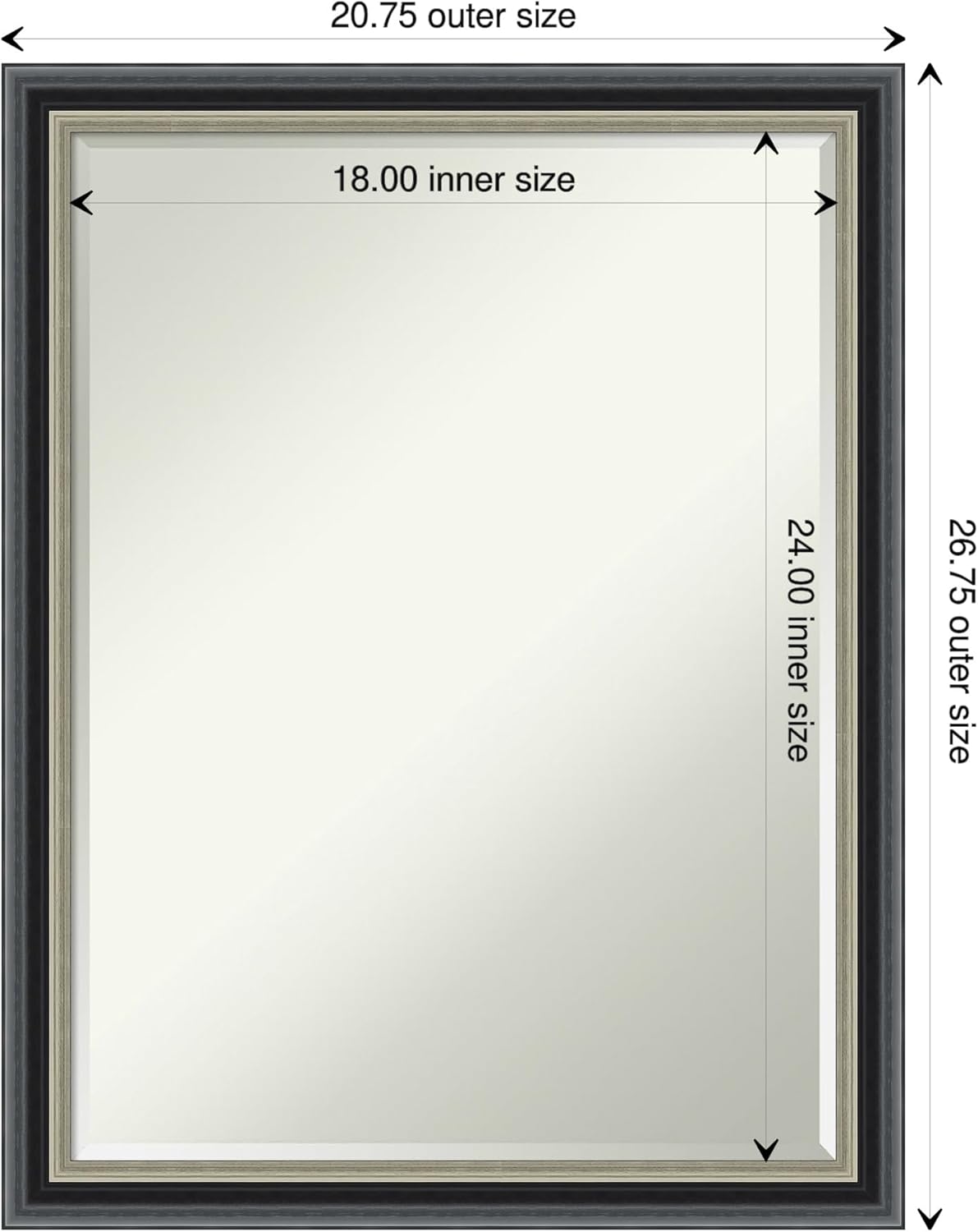 PRODUCT: Amanti Art Petite Bevel Wood Bathroom Wall Mirror; OUTER SIZE: Exactly 20.75 x 26.75 inches; FRAME: Theo Black Silver; FRAME FINISH: Satin; FRAME COLOR: Black. The Theo Black Silver frame is a decoratively curved satin finish black frame that is taller in the center and tapers down to a lightly lined silver inner lip. Give your bathroom the finishing touch with this 100% real wood-framed wall mirror. Individually made using traditional custom framing techniques, it has the quality you would expect from your local frame shop. It holds its value with premium finishing that can be appreciated up close. Because of our attention to detail and focus on artistry, architects, interior designers, and homeowners alike choose this mirror to create beautiful living spaces.