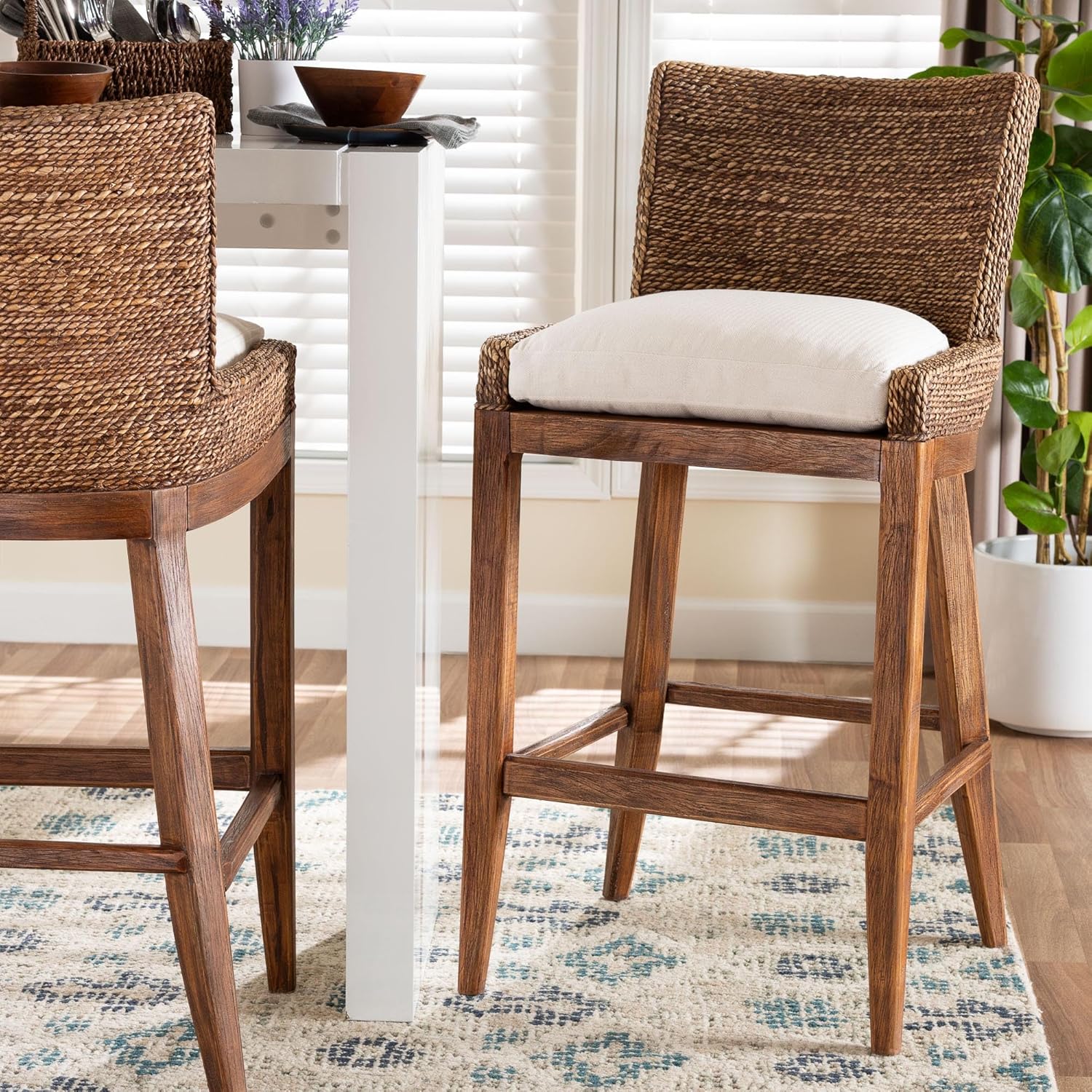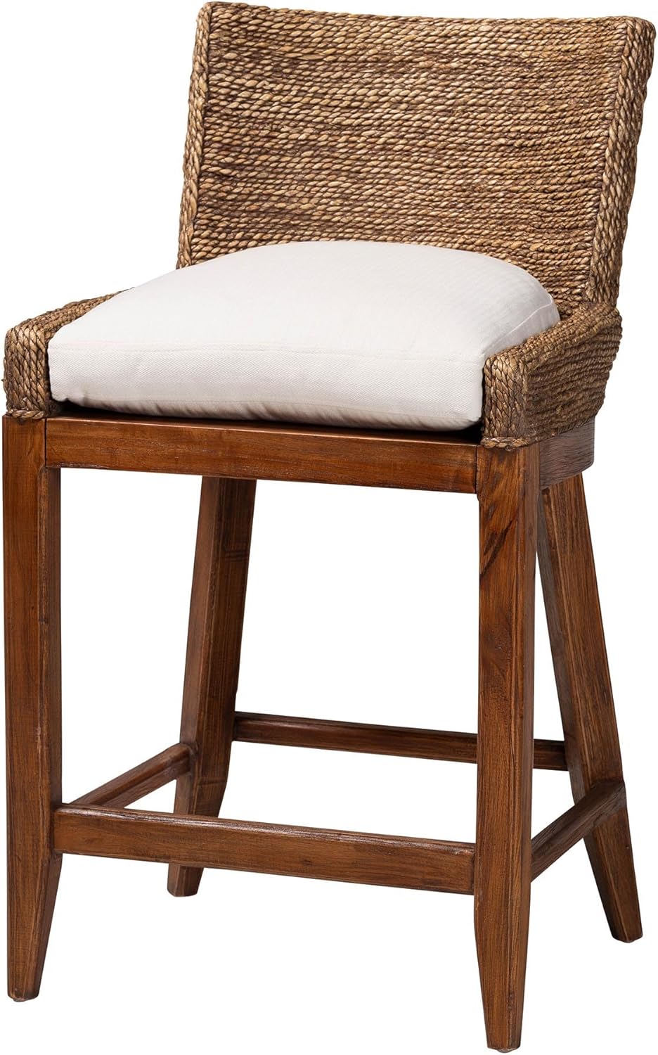 Meld modern style with rustic craftsmanship through the superb Ridley bar stool. Made in Indonesia, this bohemian piece consists of a solid wood frame topped with woven seagrass. Its classic silhouette strikes a pose of timeless elegance with a wingback design aimed for comfort. The Ridley will arrive fully assembled and is fitted with a removable seat cushion padded with plush foam and upholstered in soft fabric. Fitted with an integrated footrest, the Ridley bar stool is sure to make an impact in any setting. Disclaimer: Seagrass is a product of nature and may have variations in areas such as, but not limited to, color, pattern, grain and texture. The hair-like strands of wicker/wicker-like fiber are common due to the nature of the material.