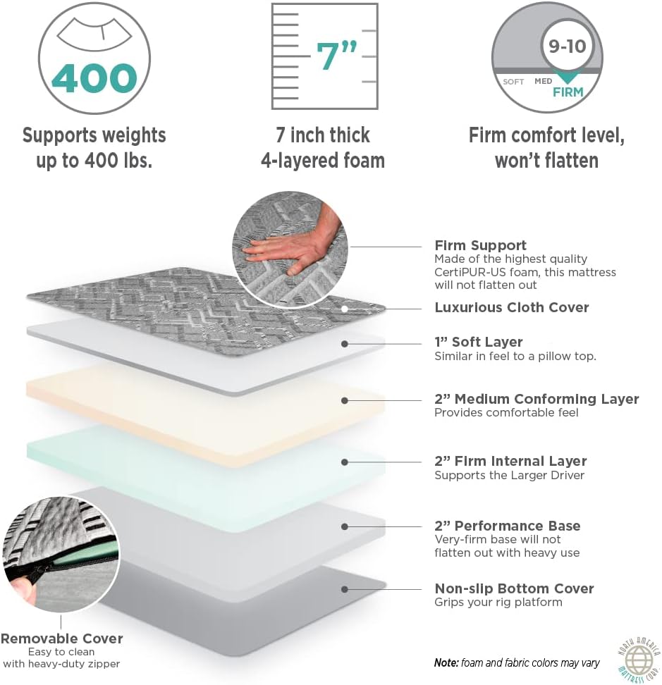 With extra comfort and support, the Big Trucker was designed with the larger driver in mind. With a full 7 inches of the highest quality foam on the road, this mattress will not flatten out. This semi-truck sleeper mattress is constructed with a soft foam top layered over medium-firm density foam. The bottom layer is extra firm, making this combination a winner for total comfort and support. Perfect replacement mattress made to fit semi-truck models.