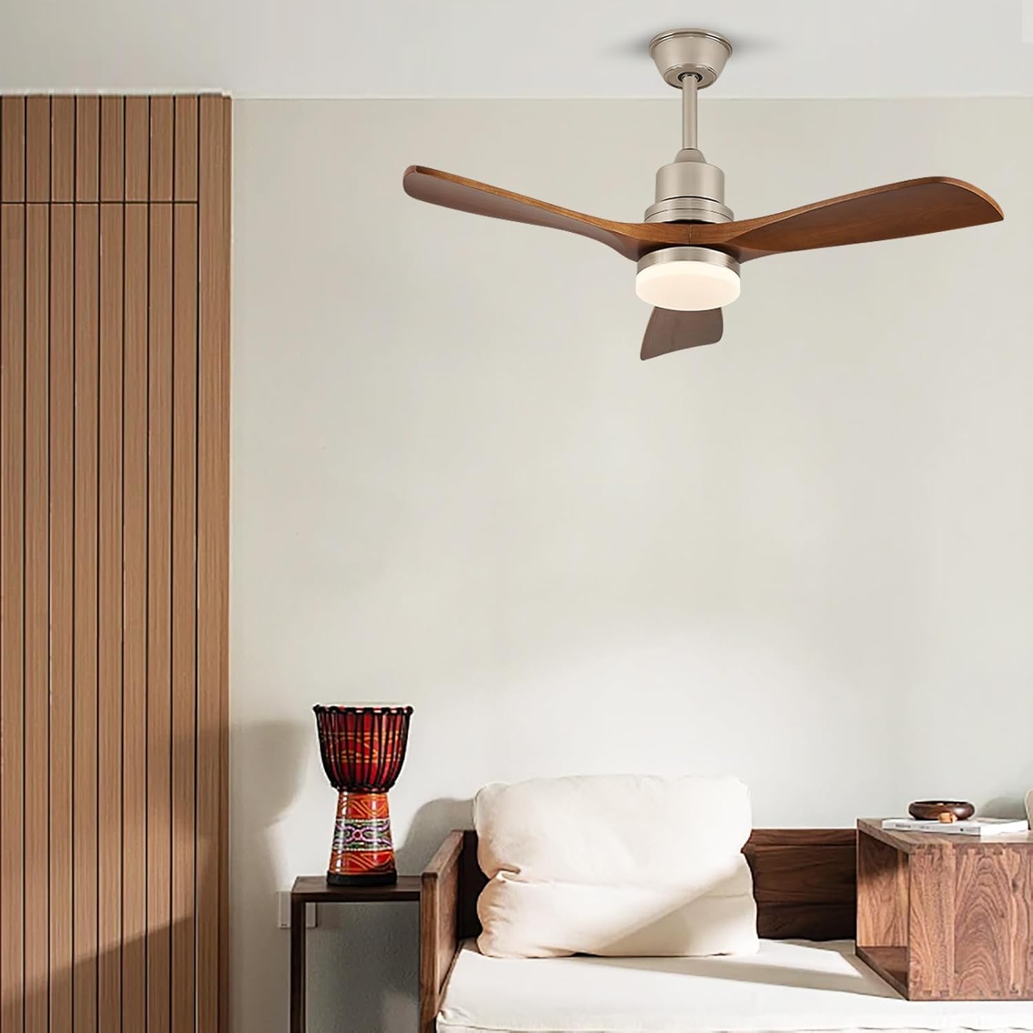 We are mainly engaged in various types of household lighting lamps, enhancing high-quality, functionally beautiful and reasonably priced lighting design products for each customer.Product descriptionTypes of: Ceiling Fans with LightsType: Ceiling Pendant Light with FansStyle: Indoor ChandelierStyle: Modern Lampshade Material: AcrylicFan Blades Material: WoodOther Material: MetalProduct Dimensions :Small Size: Lampshade Diameter: 18CMTotal Light Lenght: 106CMHeight: 33CMLarge Size:Lampshade Diameter: 29CMTotal Light Lenght: 132CMHeight: 33CMColor: As shownLight Source Type: LEDLight color: White light ( 6000K ), Neutral light ( 4000K ), Warm light ( 3000K )Voltage: 110V-220VWattage: 10W-60WWind speed: 6 gear Fan blade: 3 piecesUse space: 8-15㎡Whether the wind speed is adjustable: yes (using the remote control, low / medium / high set around the third wind speed)Light fixture form: Close to CeilingInstallation Type: Flush MountControl Method: Remote Control Lighting Method: DownlightSpecial Feature: Energy Efficient, Adjustable Light Color, Timer Room Type: Bedroom, Living Room, Conference Room, Classroom, Dining Room The package includes: 1 x Ceiling fan light 1 x Accessories package 1 x Remote control 【Distinctive Features】●Adjustable height, Easy to clean●Durable metal base, the surface is processed with the coating process, is therefore very durable【Buy with confidence】Guaranteed to have adhered the most demanding quality control procedures. Any problems,please feel free to tell us directly,We will solve the problem for you within 24 hours.