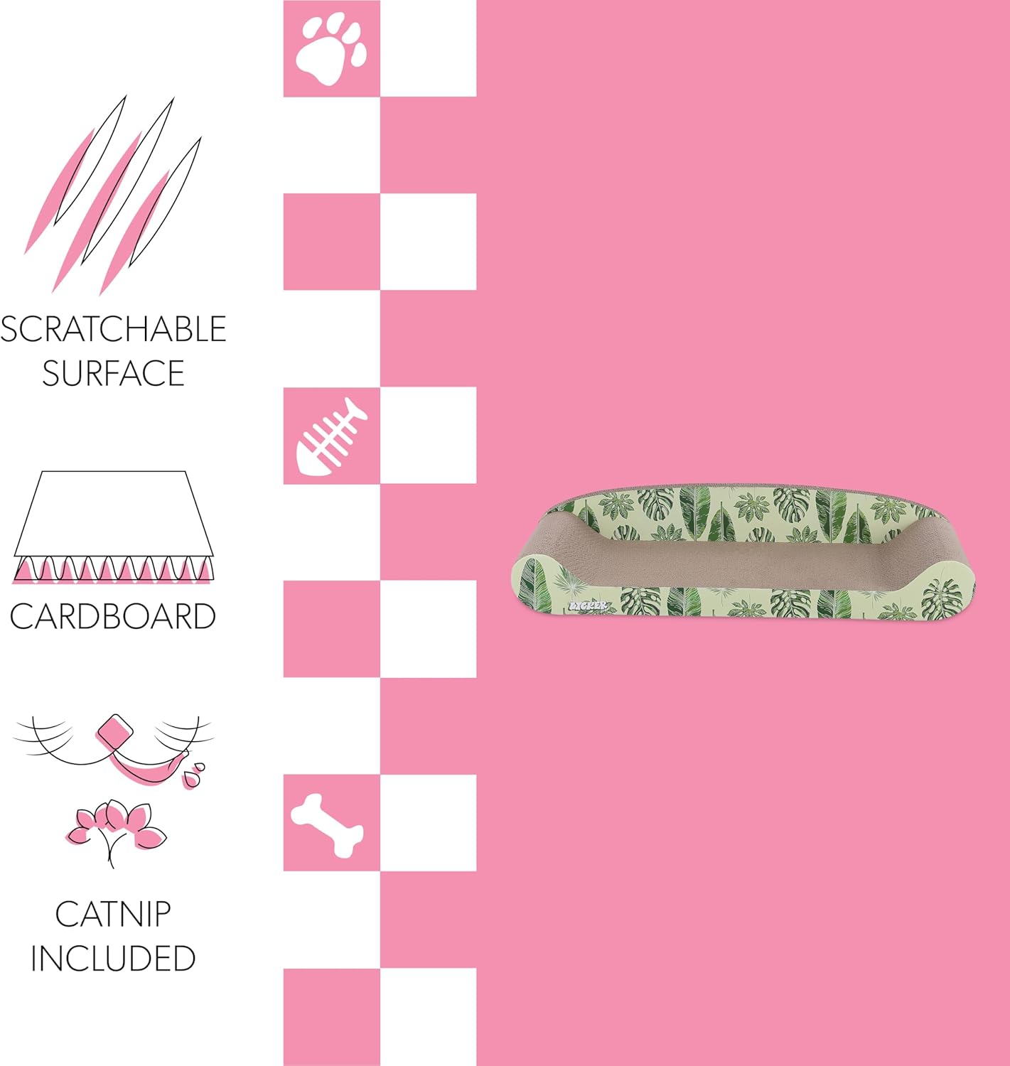 Add a tropical touch to your mid-century modern or coastal interior with our leaf-print cat scratcher lounge. The sofa-style design has a long shape for proper stretching and scratching. Cats love the comfy backrest and shapely curves for lounging.