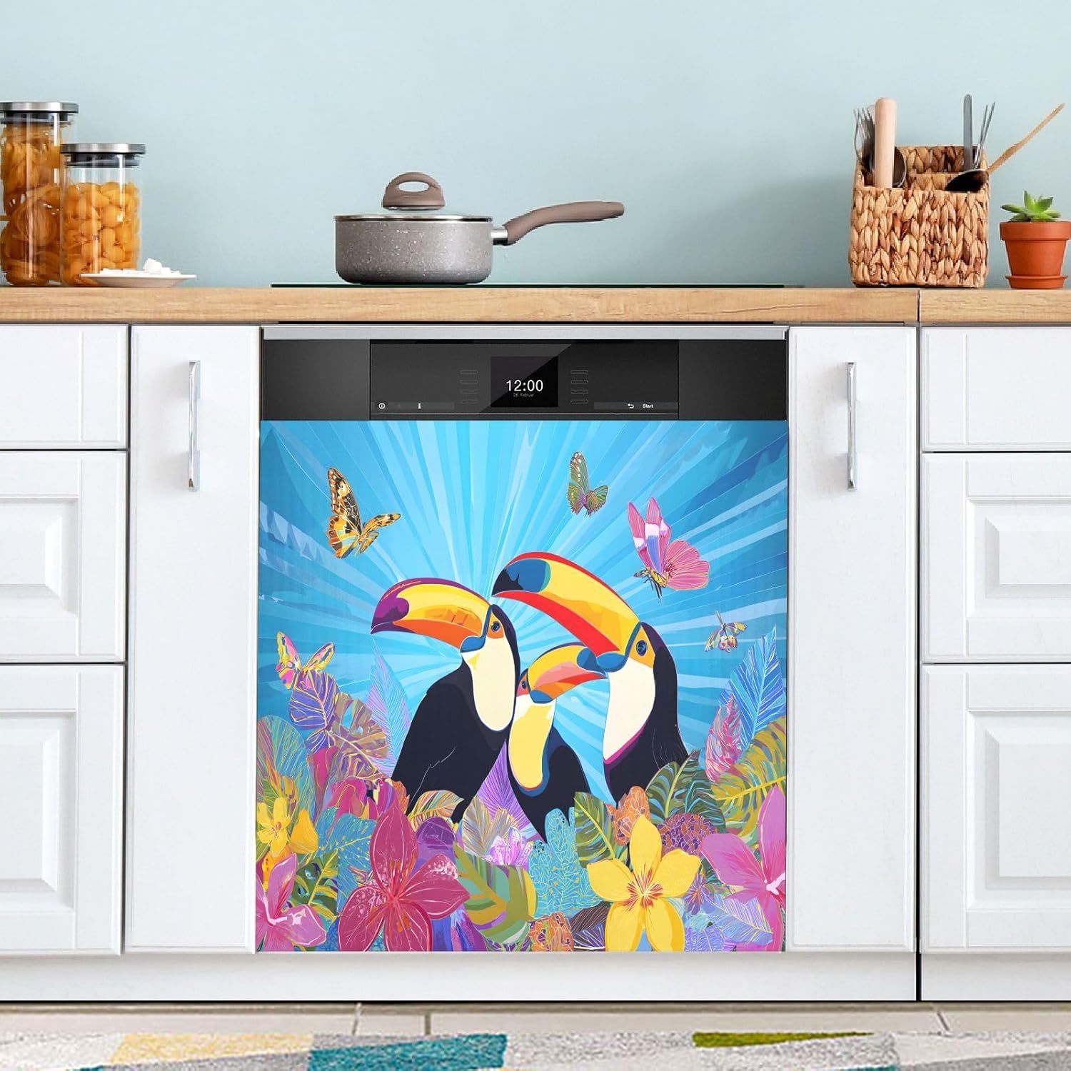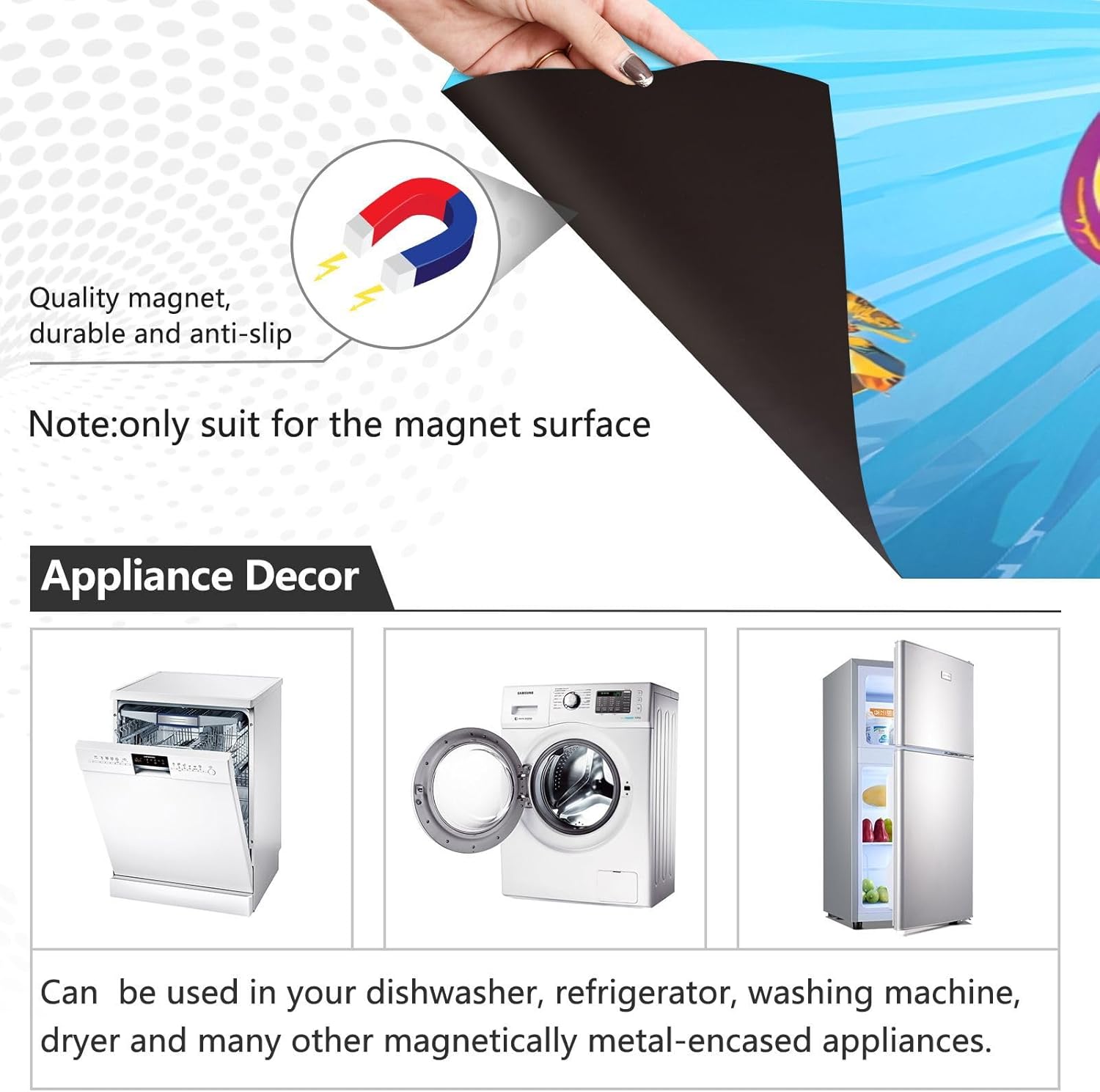 Decorate your kitchen life!This magnetic dishwasher cover is a work of art, decorating your kitchen art, with a sense of fashion and art, highlighting your quality life!Size in 23 x 26 inches. This size fits most dishwashers.Cut it to your own size to fits your need.FeatureWaterproof, heat resistant, scratch and tear resistant. Magnetic stickers hide scratches, dents or other unsightly marks.Magnetic MaterialMagnetic sticker will not fall from magnetic dishwasher and disassemble easily.Protect the dishwasher from scratches, it can also decorate your kitchen home.Please NoteMagnetic dishwasher cover is made of PVC+PET, only suit for the magnet surface.Install: Trim the proofreading position, the magnetic force on the back will stick to it.Ideal GiftYour beloved one will be happy when you give him/her this dishwasher magnet cover gift on the special days like Housewarming Day, Mother's Day, Father's Day, Birthday, Halloween, Thanksgiving, Christmas, New Year.