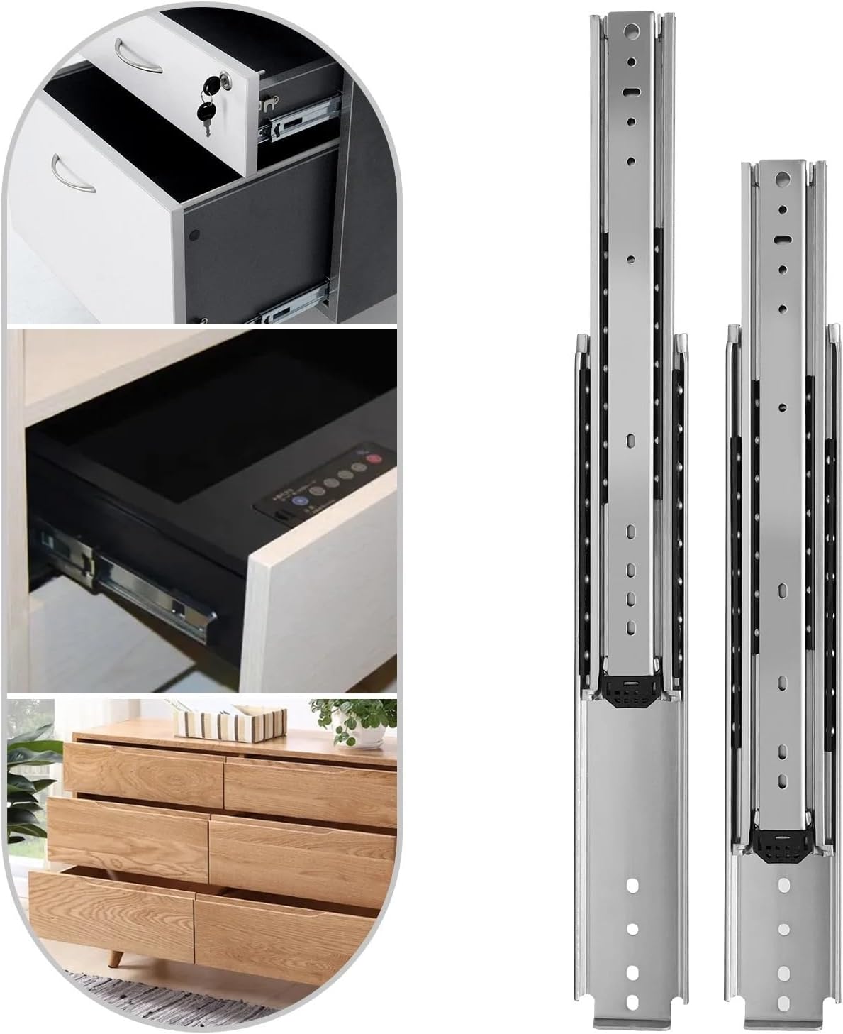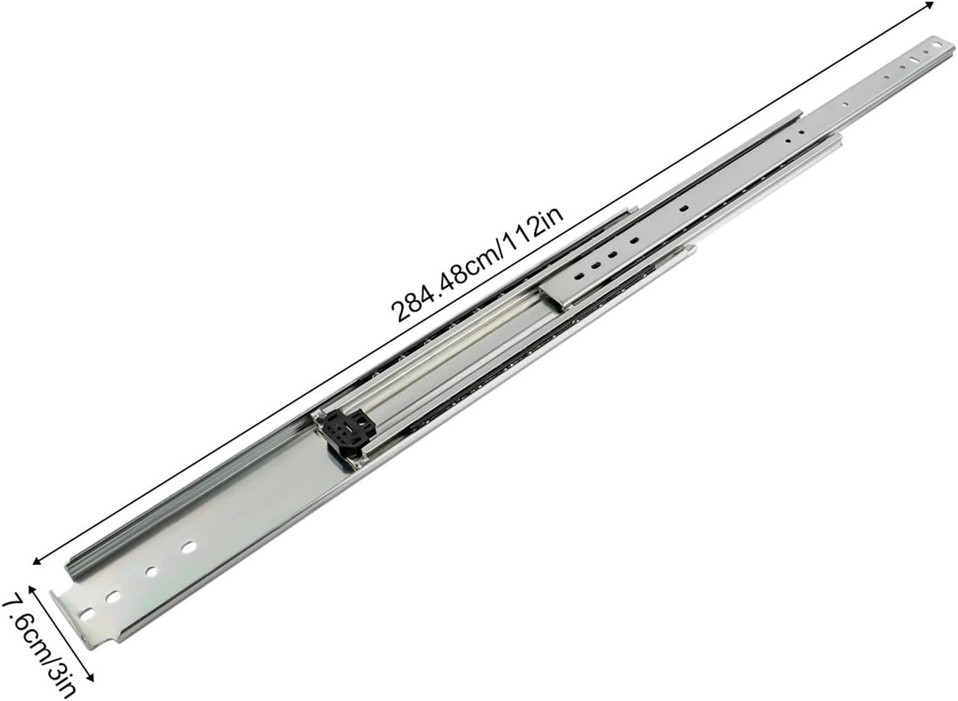 1. Easy to take down and clean,good load-bearing capacity, no shaking, and durable2. Feature a fold full extension design, enabling them to fully open for easy access3. With multiple fixed hole positions for easy installation and adjustmentSpecifications:Material: Cold-rolled steelColor: SilverSurface treatment: GalvanizedLoad-bearing capacity: 226.8 kg / 500 lbsSlide length: 142.24cm / 56 inchesSlide width: 7.6cm / 3 inchesPackaging size: 145*18*6cm / 57.09*7.09*2.36 inchesGross weight: 14 kg / 30.11 poundsDescription:This heavy-duty drawer slide is made of cold-rolled steel, which is durable and has a long service life. Cold-rolled steel has good heat resistance, so it will not get stuck under normal use. This heavy-duty drawer slide uses double rows of solid steel balls to ensure smooth and silent push and pull, and is equipped with buffer pads to prevent collisions between the three slides, which has a buffering and silent effect.Packing list:1 pair of heavy-duty drawer slidesNote: Screws are not included in the package, you need to purchase M4 and M6 semicircular head screws by yourself.