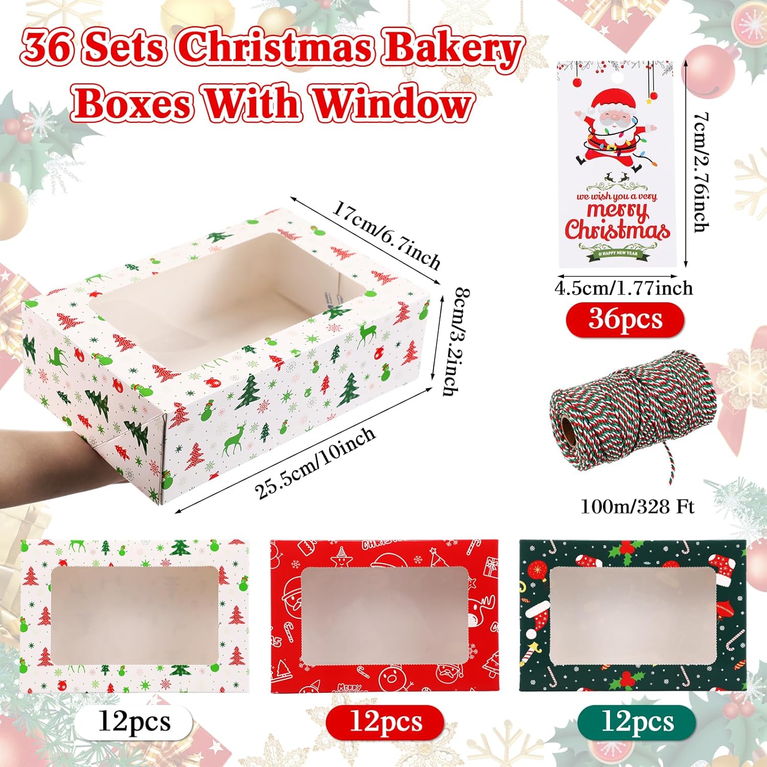 Fulmoon 36 Pcs Christmas Cookie Boxes with Window Xmas Bakery Boxes 10x6.7x3.2'' Donut Cookie Gift Containers with Thank You Gift Tag and Rope for Holiday Cupcake Pastries Food Packaging(Cute)