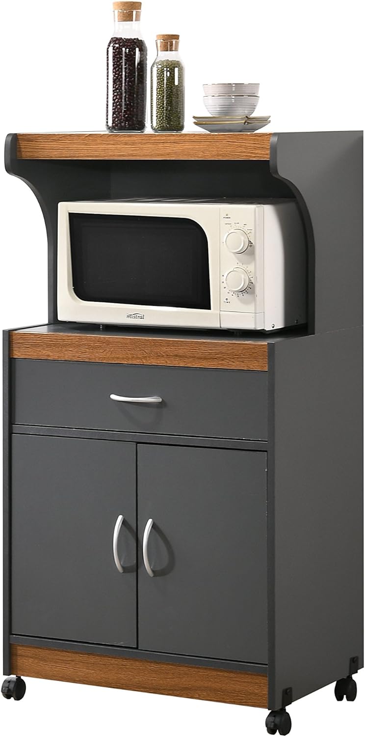 Contemporary and functional, this Hodedah Microwave Cart is the perfect solution for your kitchen storage needs. The open shelf space at the center houses your microwave and top shelf can be used to store your toaster oven. It has an enclosed cabinet space which provides compact kitchen storage for small kitchen appliances, pots and pans. It features a drawer for utensil, kitchen towels and any handy kitchen gadgets. Our microwave cart sits on wheels which allows for easy mobility if necessary. It is made of manufactured wood, which ensures strength and durability for many years to come. Perfect as a coffee station at home, office or dorm room!