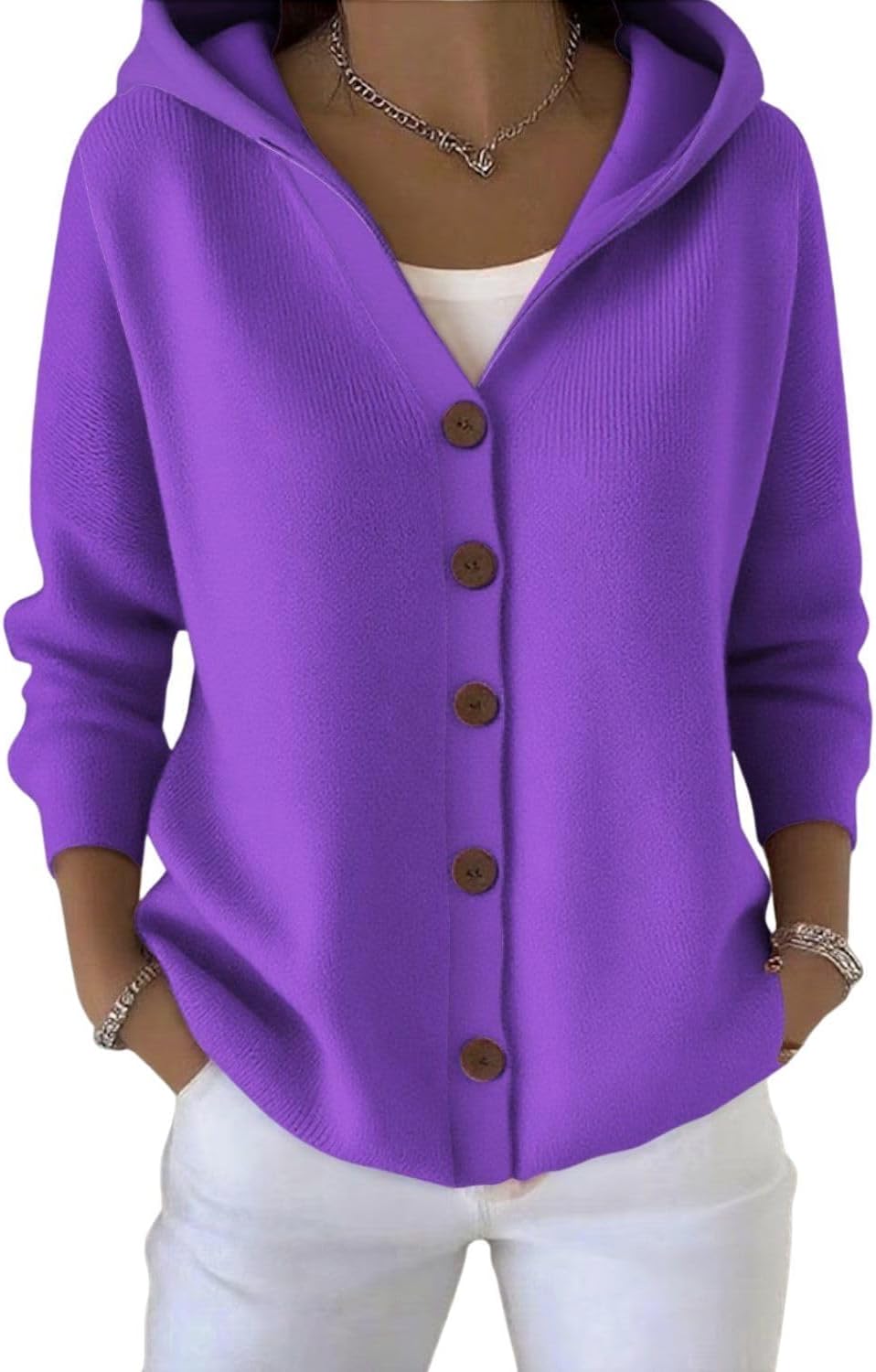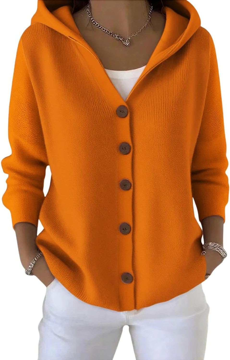 HOTYD Womens Button Down Hooded Cardigan Sweaters Long Sleeve V Neck Solid Color Sweater Hoodies Loose Fit Knit Fall Outfits