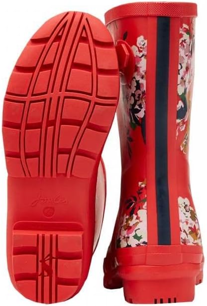 The Joules Molly Welly rain boot will add some fun to your rainy day look with a hard wearing, natural rubber upper, easy pull-on styling, a fun exterior print, and waterproof construction. Rear pull-tab provides easy entry. Round-toe silhouette. Gusset construction with adjustable strap. Signature, center-back striping detail. Topline signature plaque at front. Textile lining and insole. Removable, padded footbed. Molded, block heel. Rubber outsole with water-dispersing sole.