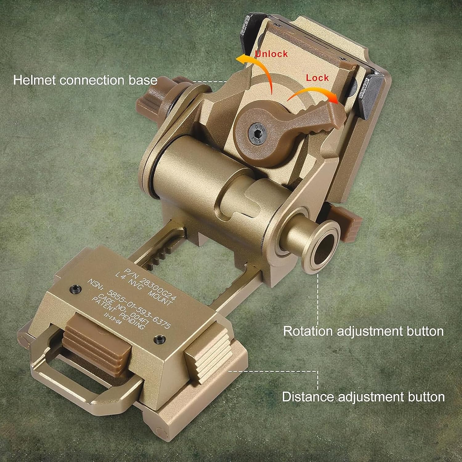 Features: 1. One-handed operation design. 2. Made of high-quality CNC aluminum alloy with high oxidation resistance. 3. Freely adjust the distance between the night vision device and the eyes. 4. Smooth matte gold surface, perfect for secret operation at night or desert tan. 5. Small size, after folding it, almost no space need. 6. Suitable for various scenarios, such as emergency rescue, CS game, adventure exploration, cycling and night outdoor activities. Descriptions 100% BRAND-NEW Color: As shown (Gold brown/Black) Size:5cmx7.5cmx7cm Match NVG devices like AN/PVS-7A 7C 15 15A 18, GPNVG18 Helmet: ACH, PASGT, MICH, M88. Package included: 1 X NVG Helmet Mount Note: Reminder: There will be some errors in manual measurement, about 0cm-2cm. Note: Due to the difference between the light source and the monitor, there may be some color deviation. If you have any concerns or questions about this product, please feel free to contact us!