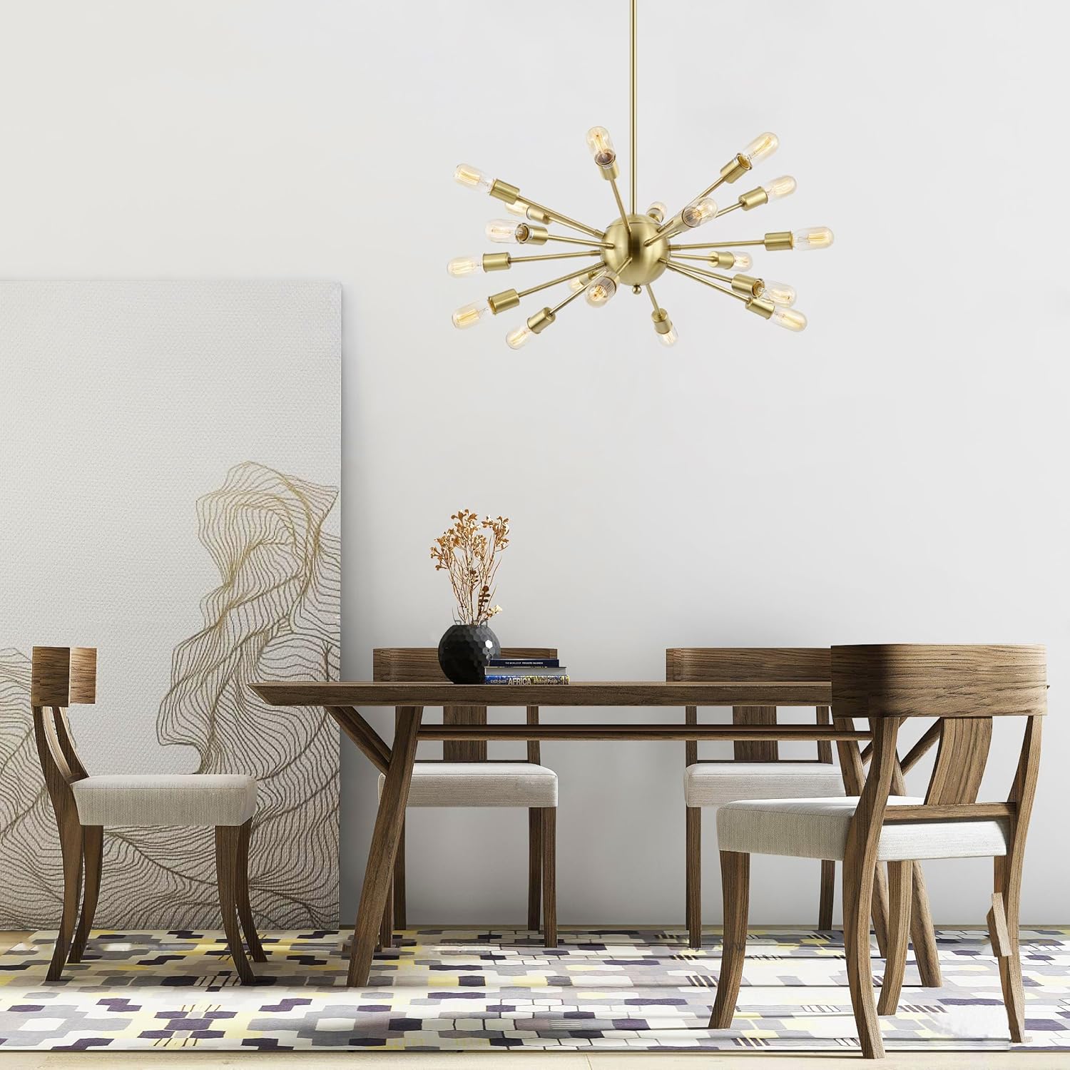 A classic starburst brings retro flair to a modern kitchen. The Sputnik Style Chandelier is a perfect example, offering updated allure with an unmistakably familiar aura that we simply can't resist. Designed in iron with a rich brass finish, this chandelier shows off 18 stunning lights to bring dimension and depth to your interior space. Over a dining table or entryway, the radiance is an inspired choice.