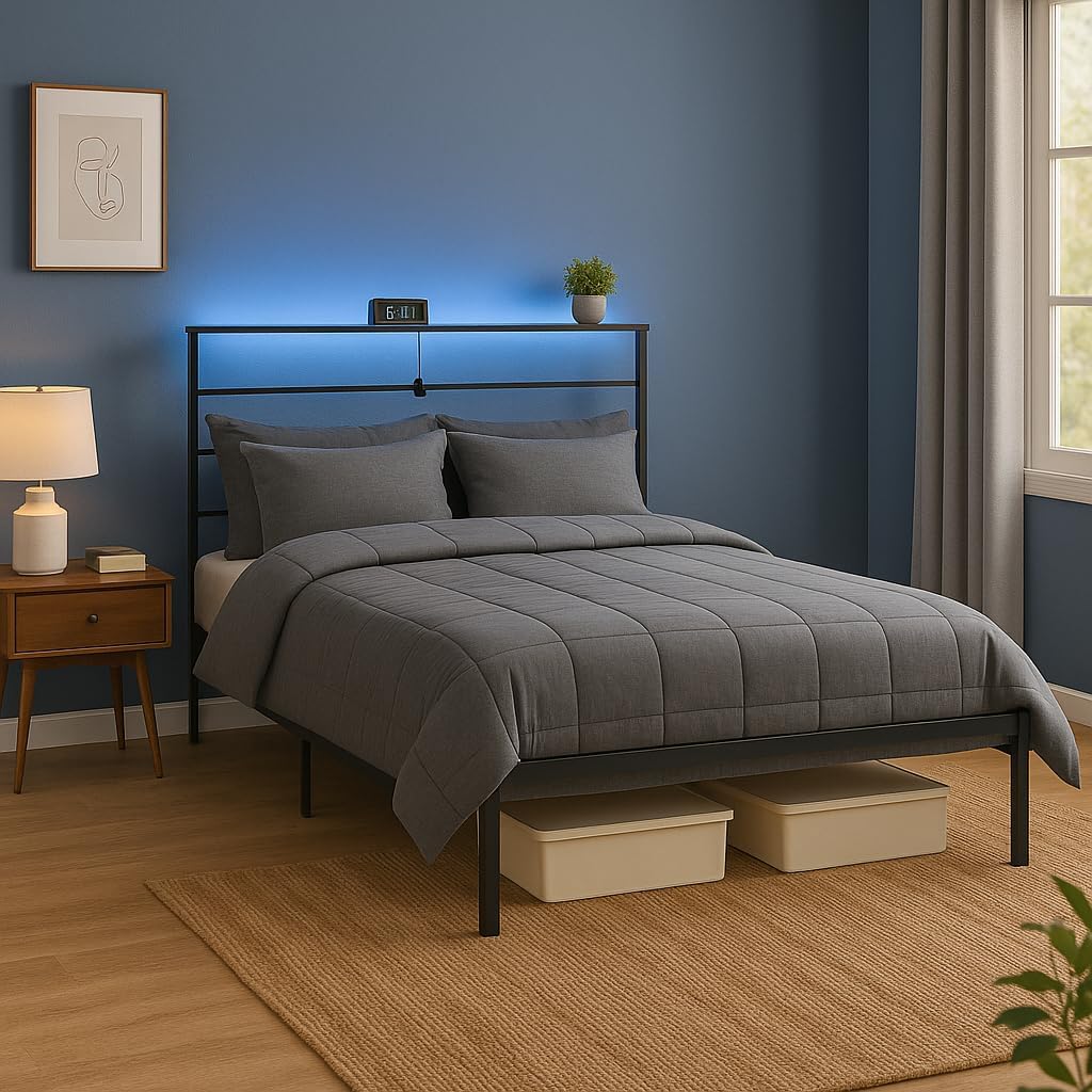 Upgrade your bedroom with this multifunctional full-size metal platform bed frame, designed for both style and practicality. The modern industrial frame features a smart RGB LED headboard with customizable colors, brightness, and dynamic modes, all controlled via smartphone app or remote. A convenient charging station with 2 outlets and 2 USB ports is built into the headboard shelf, making it easy to power devices while keeping your nightstand clutter-free. Constructed with heavy-duty steel slats, the bed provides exceptional stability and supports up to 900 lbs. With 12.5" of under-bed clearance, it offers valuable storage space for clothes, bins, or seasonal items. No box spring is needed, making setup simple and efficient. Perfect for apartments, dorms, or modern homes, this bed combines functionality, comfort, and contemporary design in one smart package.