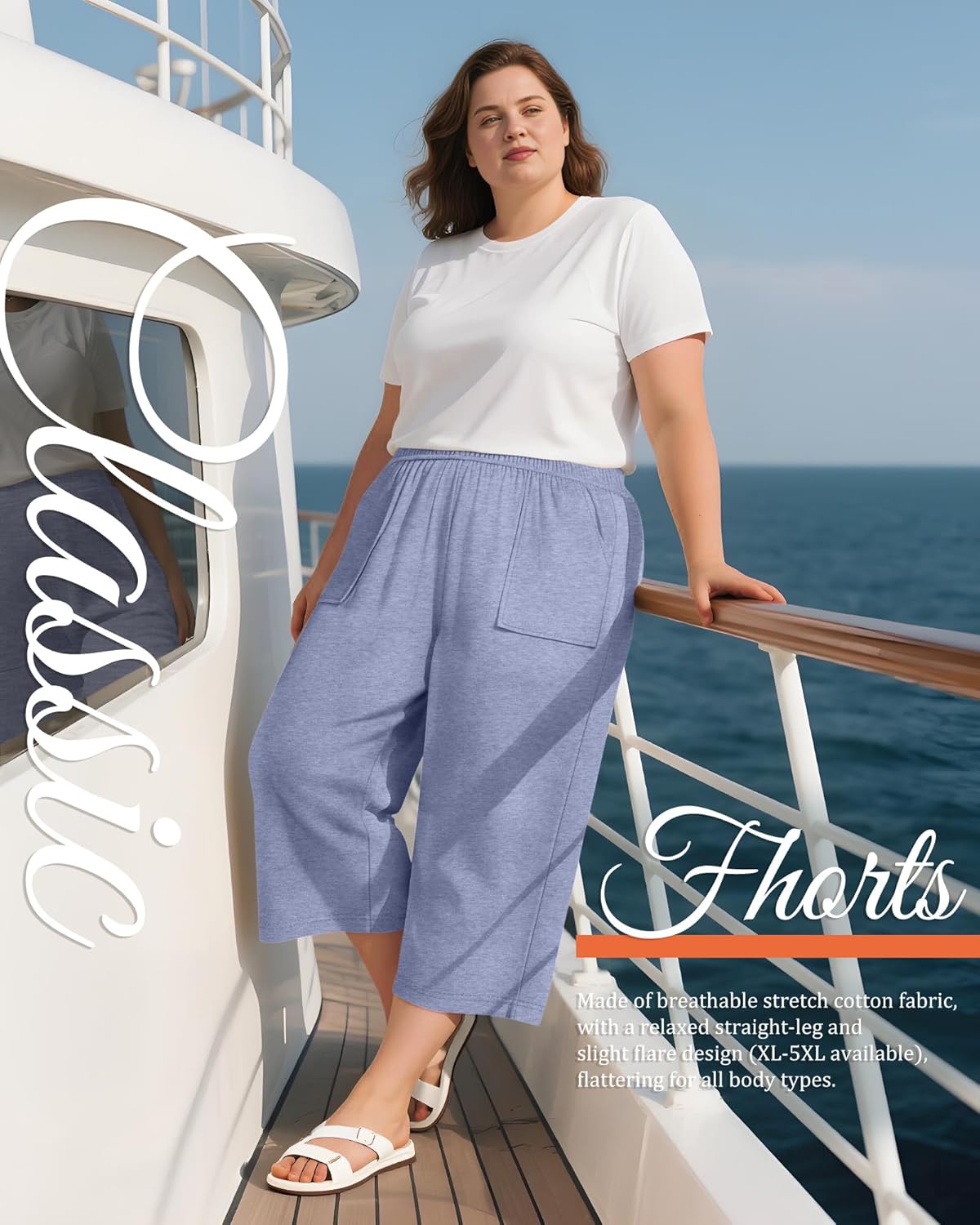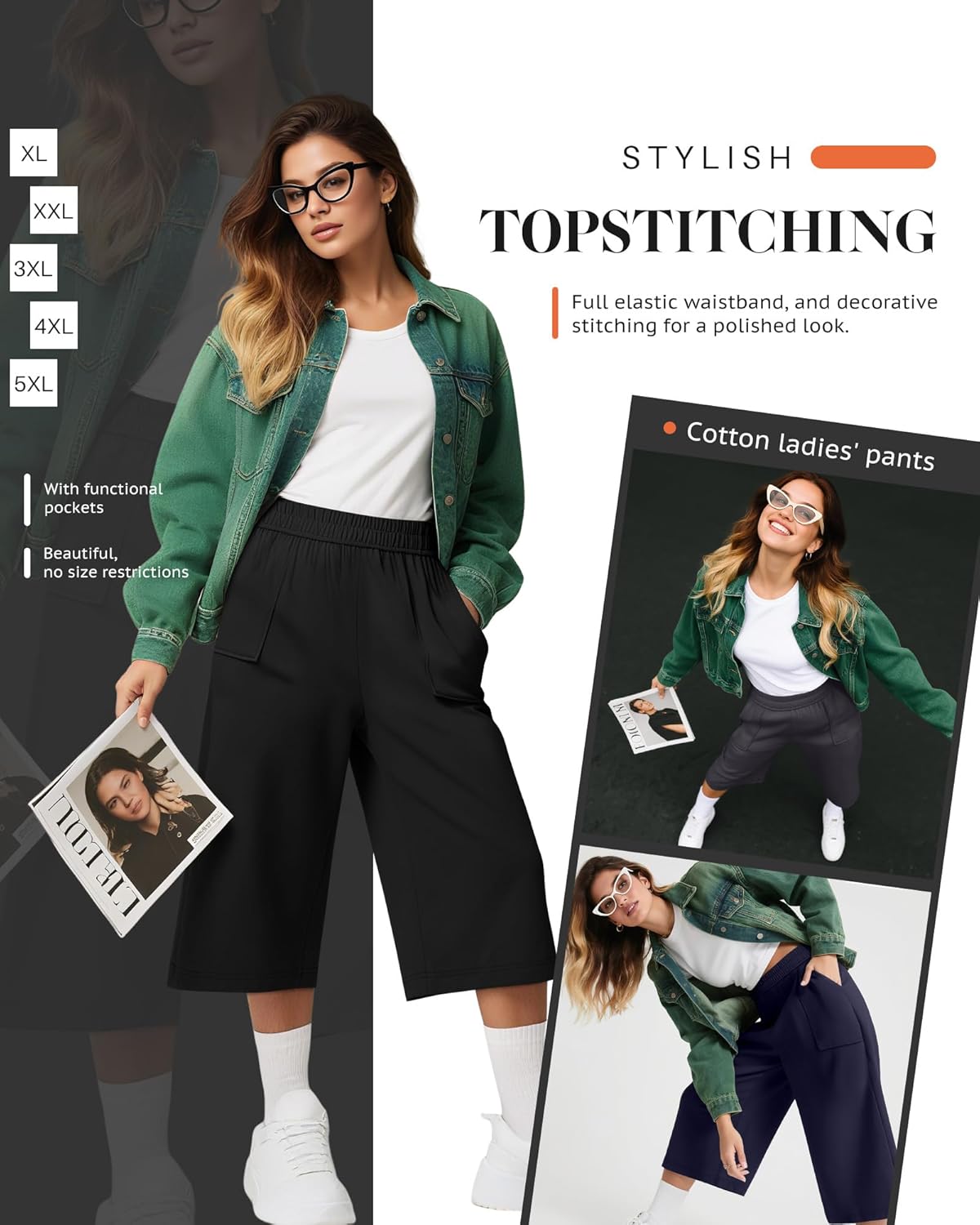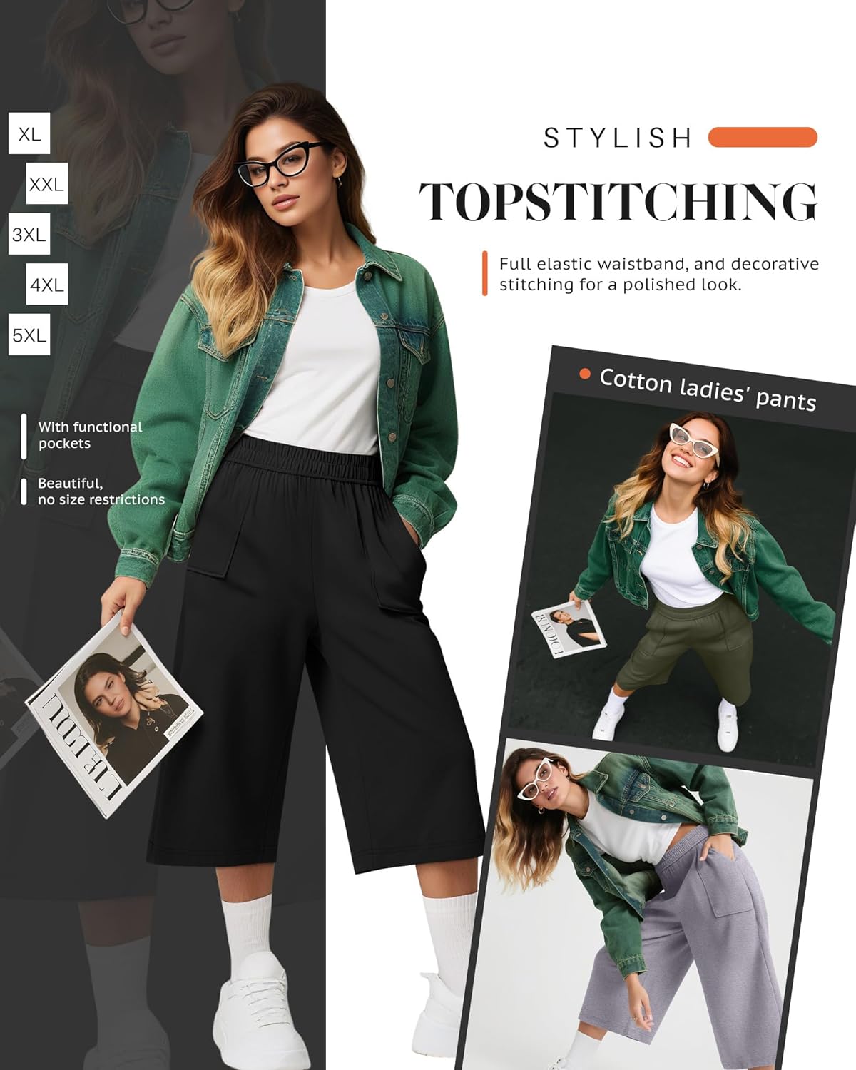 Features: Check the size chart before purchasing, it would help you find a more accurate size for yourself. Hand/machine wash in gentle with cold water, hang to dry or line dry, do not bleach, warm iron if needed, wash dark colors separately. Non see through, lightweight fabric in women's plus size capri pants. Breathable for dancing, walking, or sleeping. Elastic waistband adapts to curves. Specifications: Material: 90% Cotton, 10% Spandex Size: from XL to 5XL Package includes: 3 X Women's plus size capris Notes: Manual measurement, please allow slight errors on size. The color may exist a slight difference due to different screen displays.