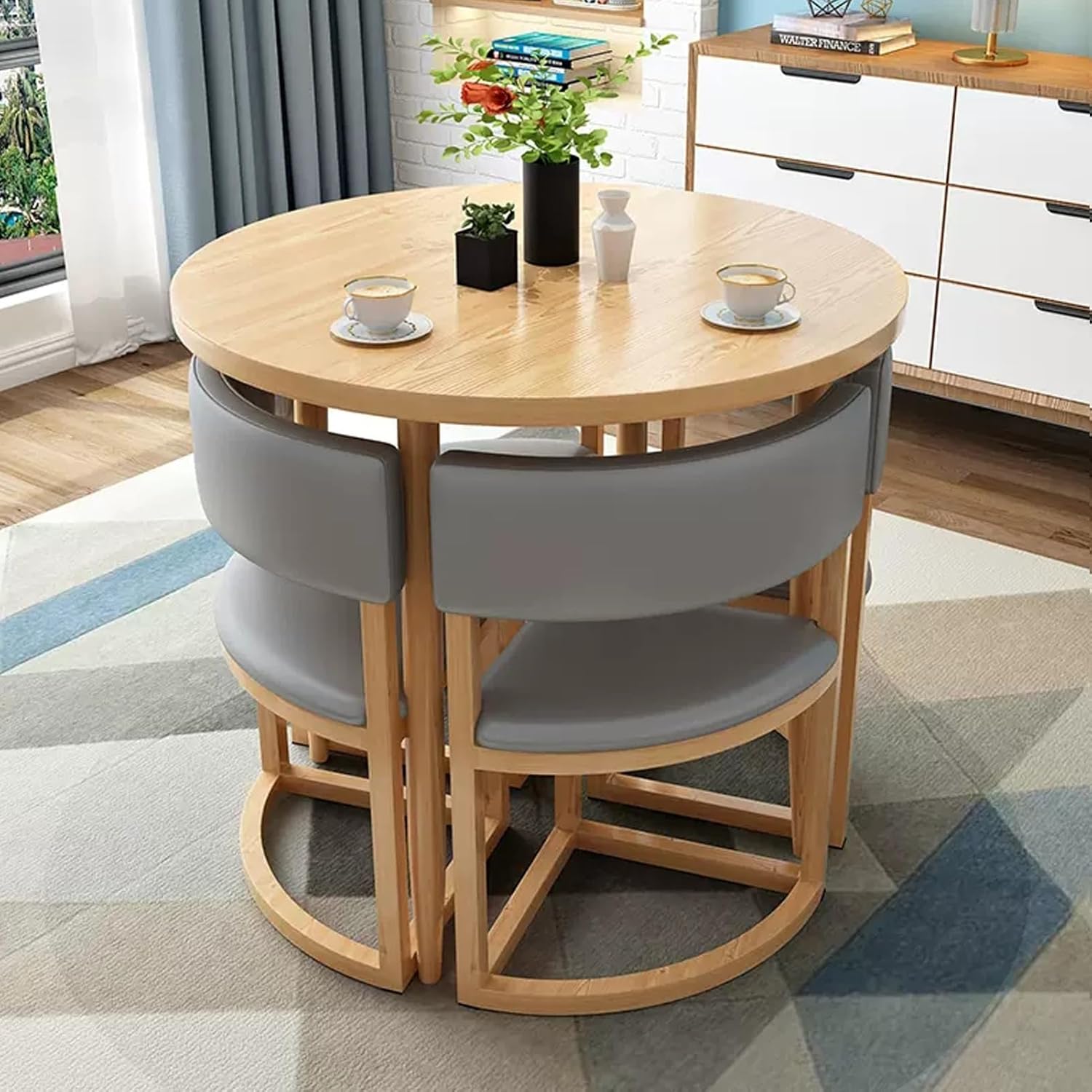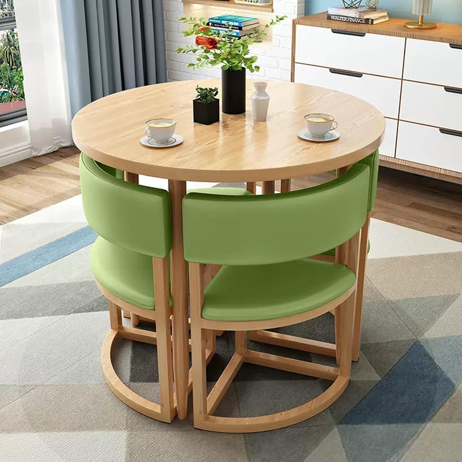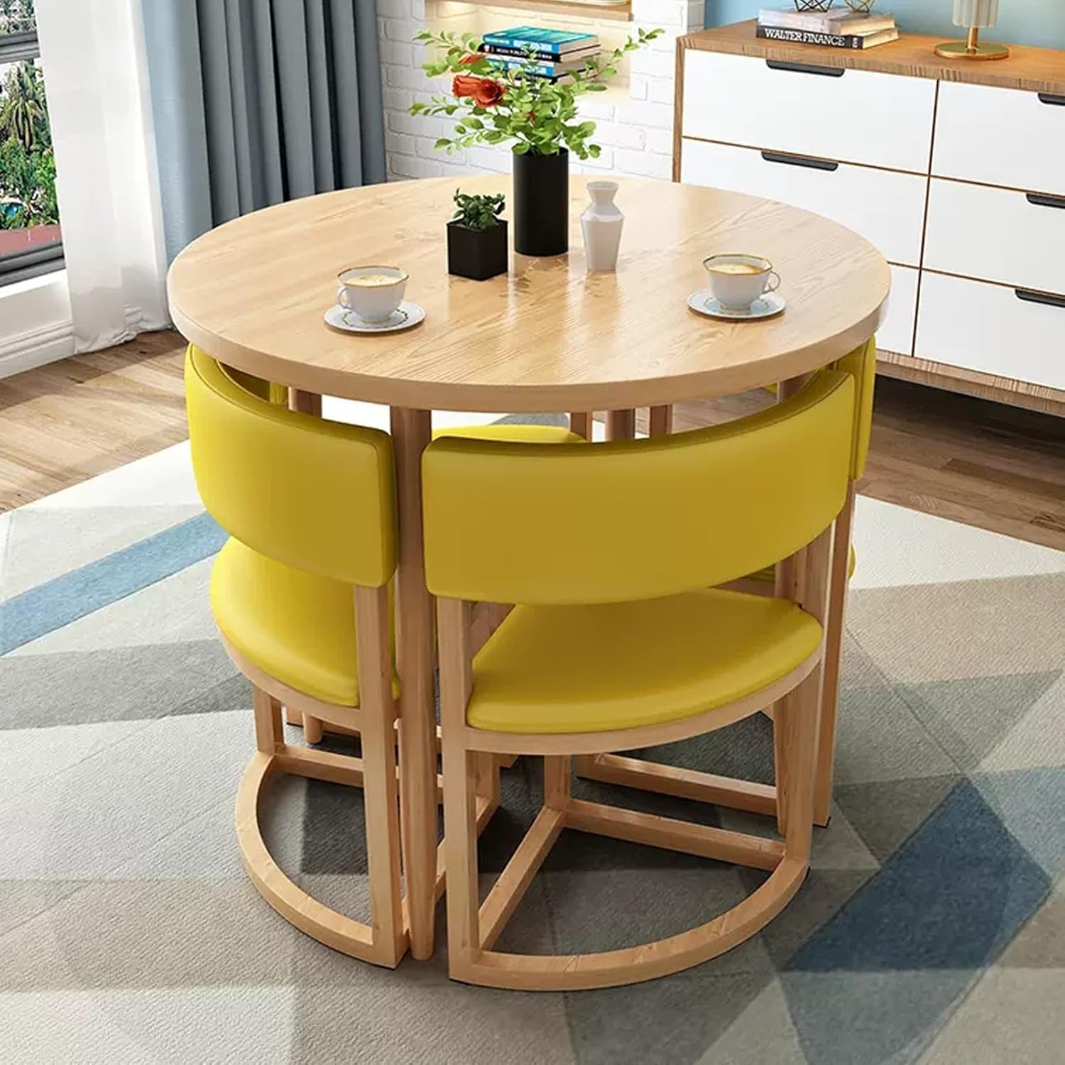 Coffee Shop Leisure Table and Chair Combination,at Office Reception Room, this Office Table and Chair Set can also be used as a small dining table in the kitchen or as a small conference table in the office.This kitchen dining table and chair set also can be placed in your beauty shop, nail salon shop, beverage shop, hotel lobby or Variety Business shops.Product Parameters:◆ Product Name: Table and chair combination◆ Color: Yellow A , Blue , Green , Gray A , Orange A , Khaki , Orange B , Yellow B , Gray B , Gray C , Yellow , Orange C◆ Features: Simple, generous, space saving◆ Bracket structure Material: Metall◆ Table shape: Round◆ Desk top material: E1 grade environmental protection plate◆ Table top diameter: 80cm/31.5in◆ Chairs material: PU leather◆ Total chair height: 75cm/29.5in◆ Applicable scenes: office, coffee shop, tea shop, reception, restaurant, library, cinema, clothing store, maternal and child shop, living room, etc.◆ Applicable number: 4 people◆ Packing method: assembly◆ Packing list:1*table,4*chairs (other things are decorations, not included)Warm Tips:1. Size Description: The product is completely measured by hand and may have an error of 1-3 cm. Please refer to the actual items received.2. Picture description: The product is real. Due to problems with light, angle, display, etc., there may be slight chromatic aberration, please forgive me.