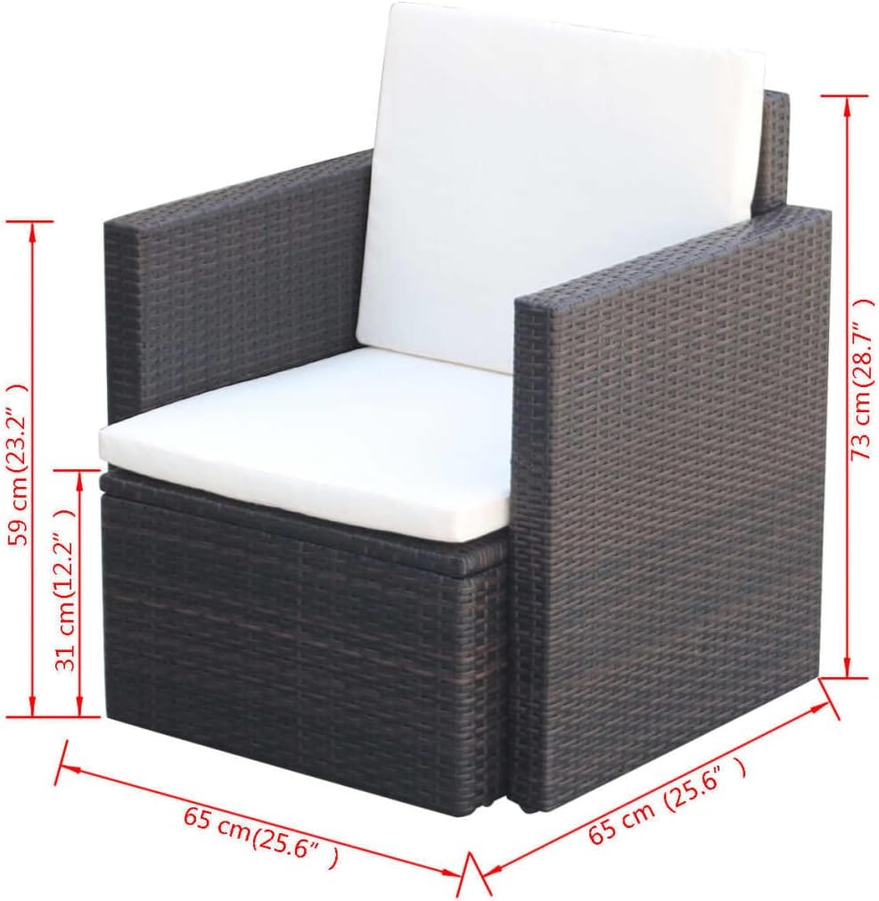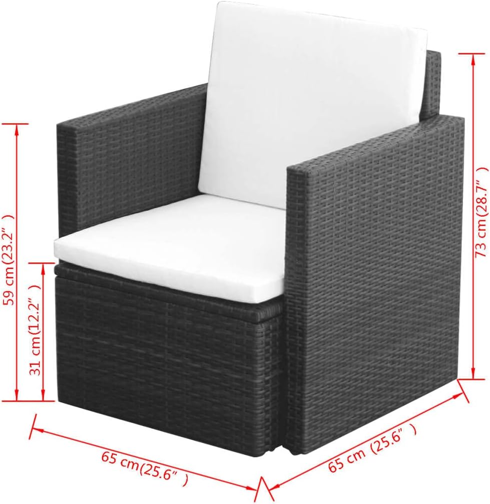 This rattan armchair will make a addition to your patio living space. It will add a touch of modern elegance to your patio, balcony or garden with its understated, yet stylish design.Made of weather-resistant and waterproof PE rattan, this outdoor armchair is easy to clean suitable for daily use. The powder-coated steel frame makes the armchair very sturdy and durable. Thanks to the lightweight construction, it is easy to move and store when not in use.This armchair is delivered with highly comfortable, thickly padded seat and back cushions. The cushion covers are removable and washable.Note 1): We recommend covering the set in the rain, snow and frost.Note 2): This item will be shipped flat packed. Assembly is required; all tools, hardware and instructions are included.Rattan color: BlackCushion color: Cream whiteMaterial: Steel frame + PE rattanCushion material: Polyester cover with foam fillingTotal size: 25.6" x 25.6" x 28.7" (W x D x H)Seat width: 21"Seat depth: 23.6"Armrest height from the ground: 23.2"Seat height from the ground: 12.2"Seat and back cushion thickness: 2"