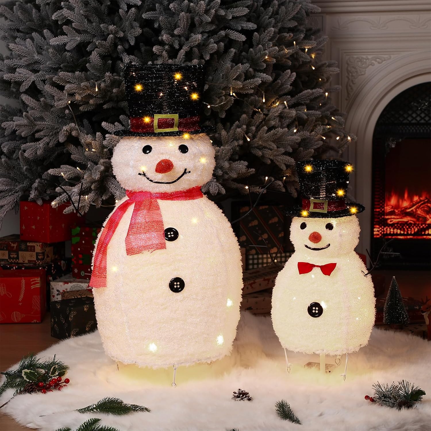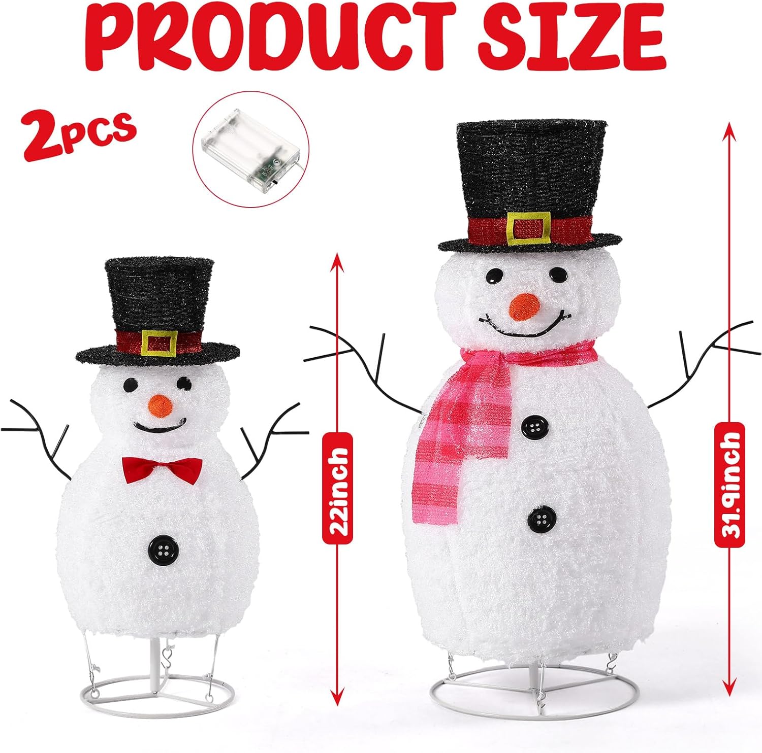 Features: Made from quality hairy material, these snowmen porch decorations are built to last, making them a reliable choice for holiday decorations. The vibrant multicolor finish not only catches the eye but also resists fading, allowing you to enjoy their beauty throughout the holiday season and beyond. At the end of the holiday season, our lighted snowman decorations indoor offer a convenient storage way. They can be easily stored without taking up much space. This thoughtful design allows you to enjoy the beauty of these decorations without the hassle of complicated storage. Specifications: Material: hairy material Color: multicolor Size: about 20 inches, 32 inches in total height Package includes: 2 x Lighted snowmen decor Notes: Manual measurement, please allow slight errors on size. The color may exist a slight difference due to different screen displays Warm reminder: ''For safety and longer life, always fully unfold the bulbs before use. Bundling them can cause overheating and hazards.''