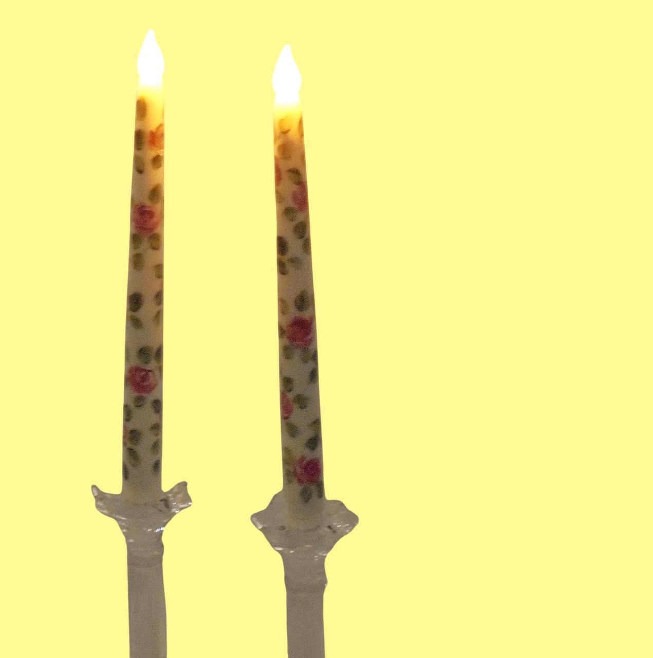 A set of flameless ivory taper candles, decorated with gorgeous hand-painted pink roses and golden-green leaves that will add romantic charm to any setting! Set them out anywhere to add a warm, softly-flickering amber glow, without the worries of real-flame candles....and they can be used again and again, unlike traditional candles! Just add "AAA" batteries and with a twist of their bottoms, each taper will bathe the room with soothing light! What a charming addition to your decor or they make a unique gift for a fellow Romantic! Set of Two Flameless Ivory Taper Candles, 11" high, 3/4" wide (each set requires 4 "AAA" batteries...batteries not included)