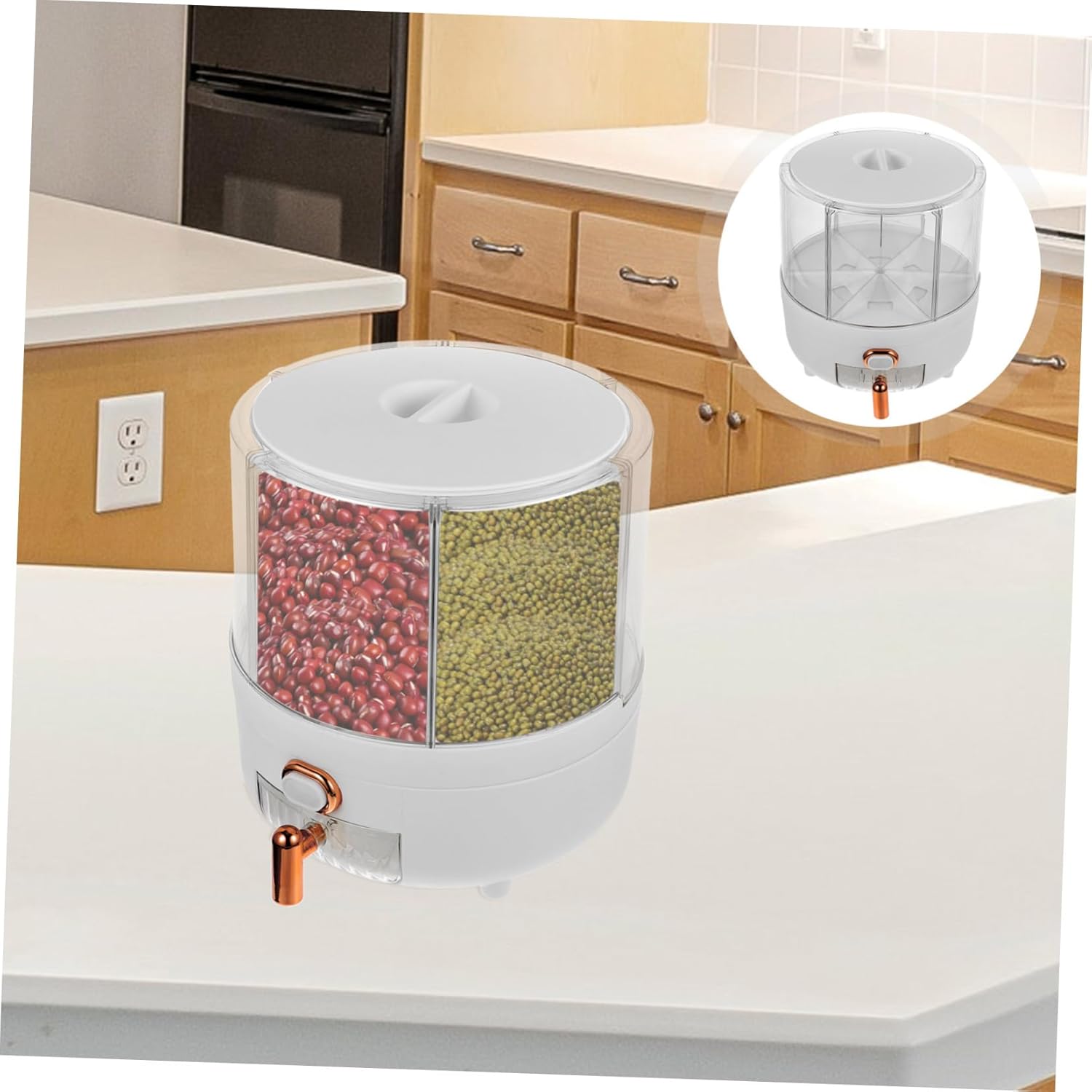 Package List 1 x rice dispenser Features -Material:PP food storage container -Size:22.00X22.00X24.50cm/8.65X8.65X9.63in rotating grain dry food dispenser -Color:White rotatable food storage container - Button design, push to release, very convenient to get the rice and bean, suitable for daily use grains dispenser. - Comes with measuring cup, more convenient to control the quantity you need countertop grain dispenser. - The grain dispenser is designed with six compartments for sorting and sorting without mixing grains multi grain dispenser. - Suitable for storing of dry food like rice, beans, grains, cereal, etc. A necessary and must accessory for kitchen grain dispenser for kitchen. - Can fit above or under your kitchen counter or cabinet easily. The color matching is simple and beautiful rotating grain storage container.Goods Informationlarge capacity grain dispenser This large container maximum freshness and prolonged food storage by sealing tightly.round grain dispenser They will protect your food from air and water so that you never have to worry about your favorite foods turning stale again! Can be used as a housewarming to your friends