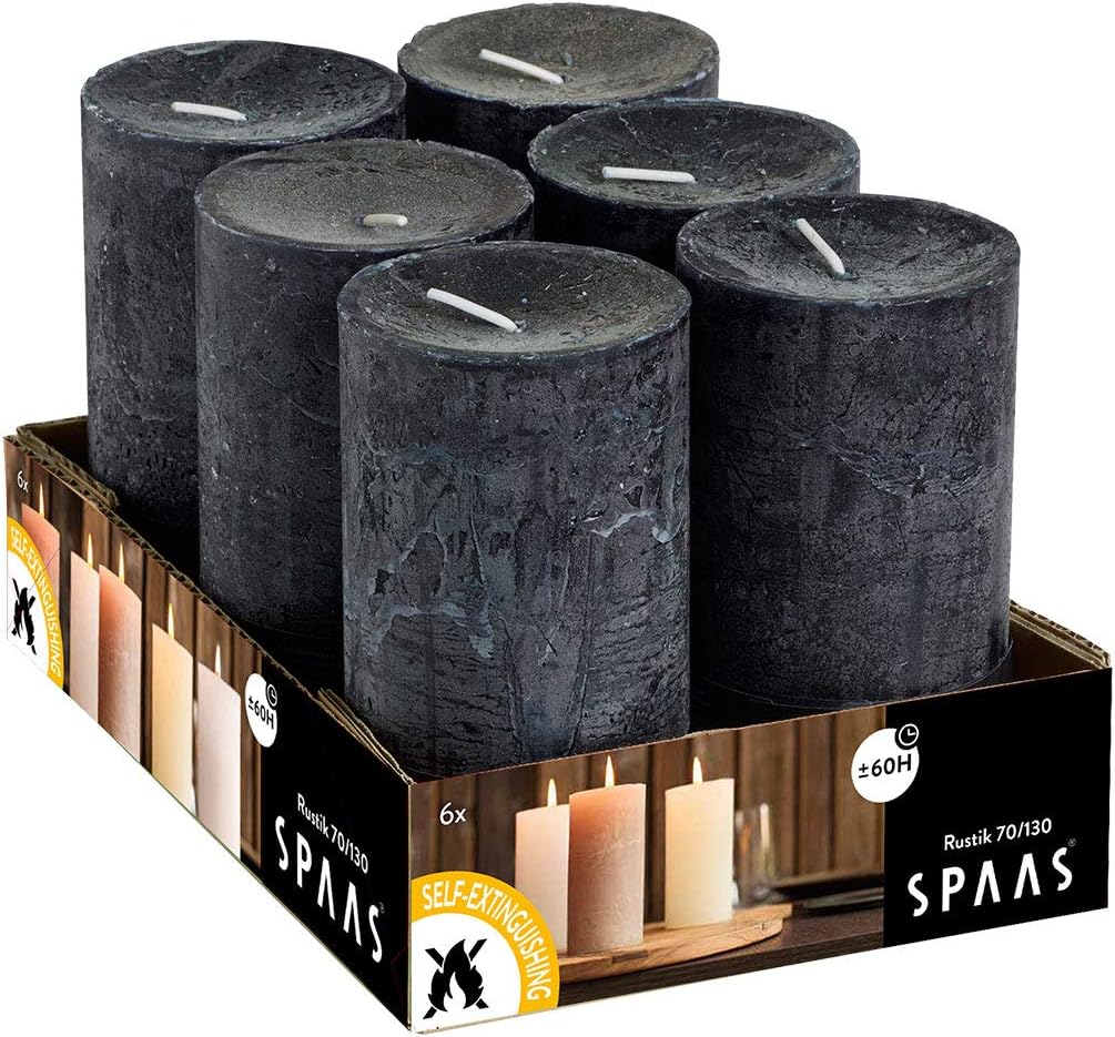 | Included Components | 1 x Spaas 6 Rustic Unscented Rustic Pillar Candles 70/130 mm, ± 60 Hours, Black |