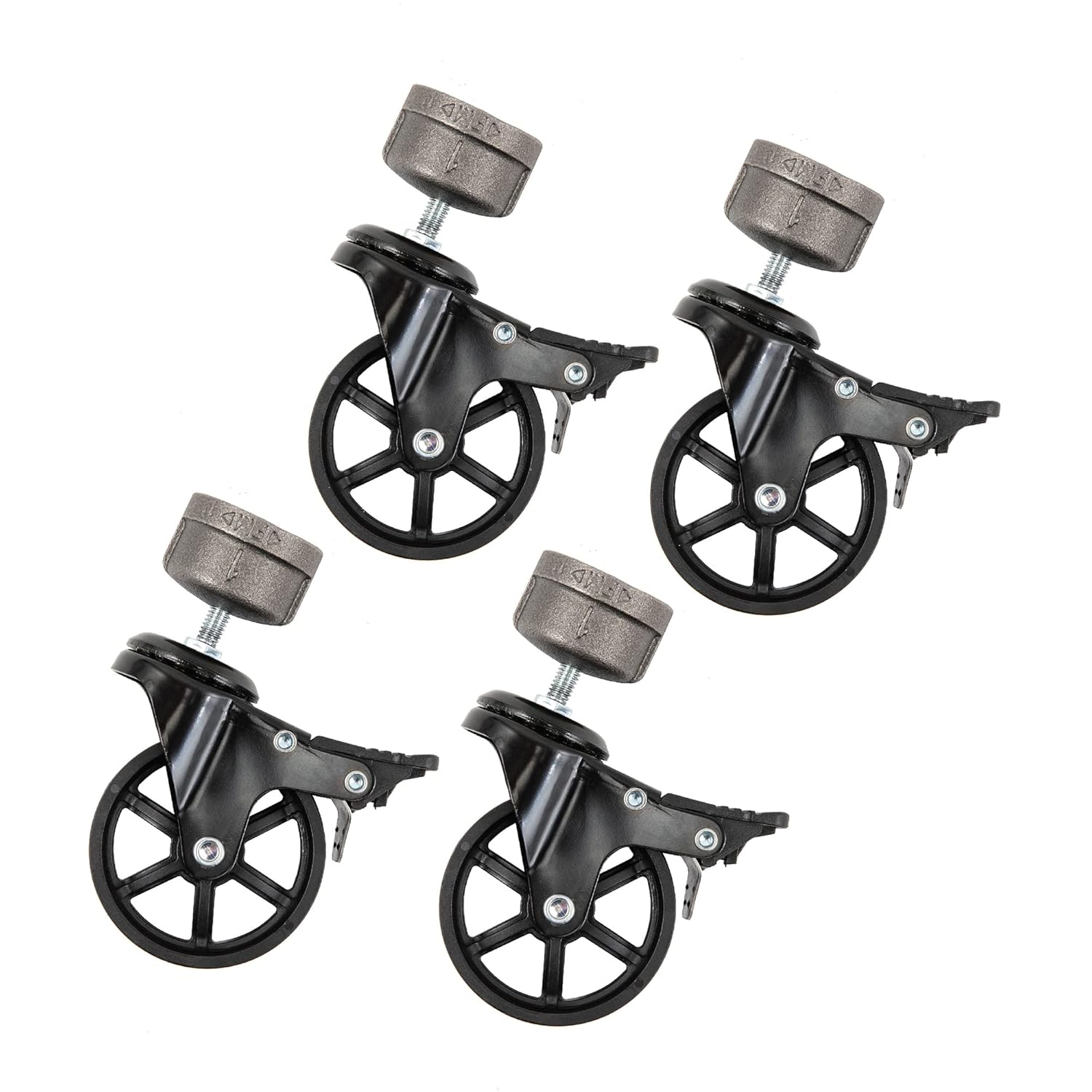DIY your way with PIPE DECOR! Transform any piece of pipe furniture into a mobile masterpiece with our 4-pack of floor casters. These caster wheels have a 360-degree swivel supported by sturdy ball bearings, so you can smoothly maneuver into tight spaces with no squeaking noise and no floor scuffing. These casters are perfect for home, office, or industrial use. Create rolling work benches, tool carts, bar carts, storage racks, side tables, and more. Anti-slip stripes on the toe brake make it easy to lock and unlock as needed. This caster fits snugly onto the end of any 1-inch diameter pipe or fitting. No tools are necessary for installation. Ask us anything. The PIPE DECOR team is standing by to help you with any questions or concerns. We're happy to assist with product inquiries or instructions, and if there's a problem with your order, we want to make it right. Contact us through the Buyer-Seller Messaging Service. Manufacturer part no. 365CASTC1-4
