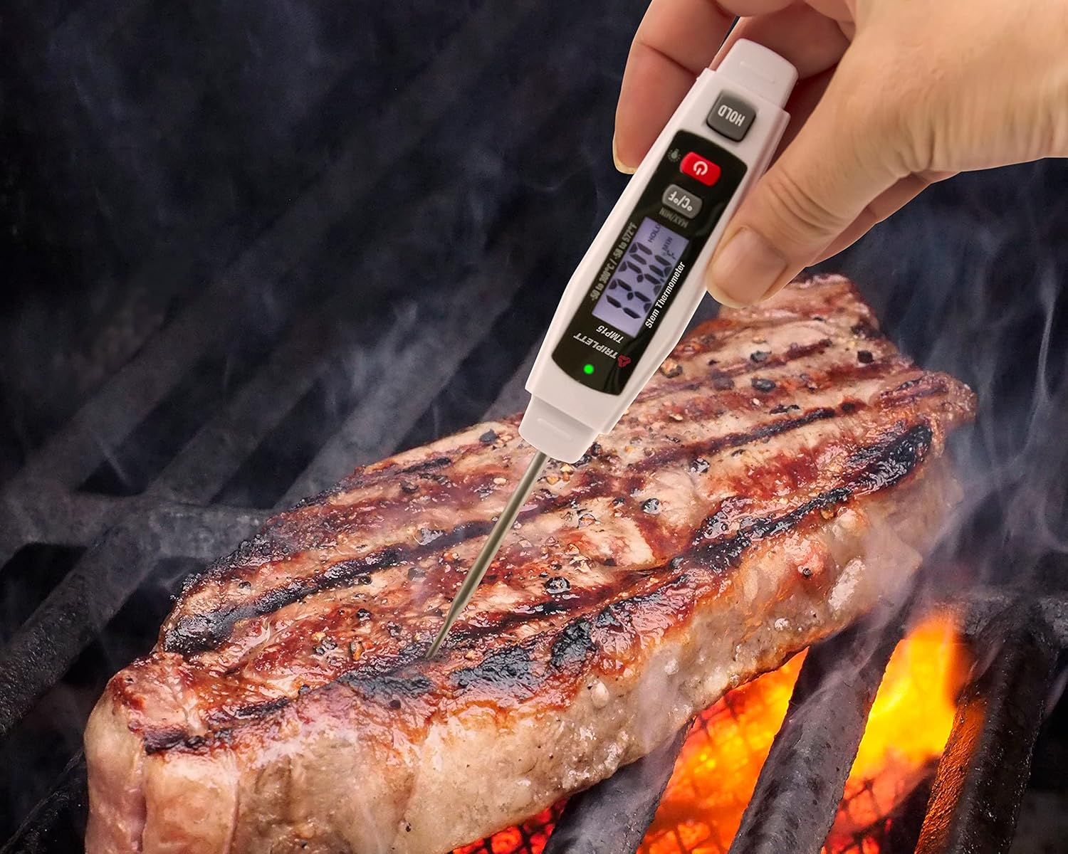 The Triplett TMP15 Stem Thermometer has a 2.5" (63.5mm) food grade stainless steel probe with thin 0.08mm diameter tip for measuring the temperature of liquids and semi-solids. It has a 1 second sample rate, temperature range of -58 to 572°F (-50 to 300°C) with 0.1°F/°C resolution and a basic accuracy of ±1.8°F /1°C. A built-in LED alarm light turns red when temperature exceeds 212°F/100°C, and green when temperature is lower than 32°F/0°C. It features Min/Max and a Data Hold function that freezes the reading on the backlit display. Comes complete with an CR2032 battery and protective probe cover.