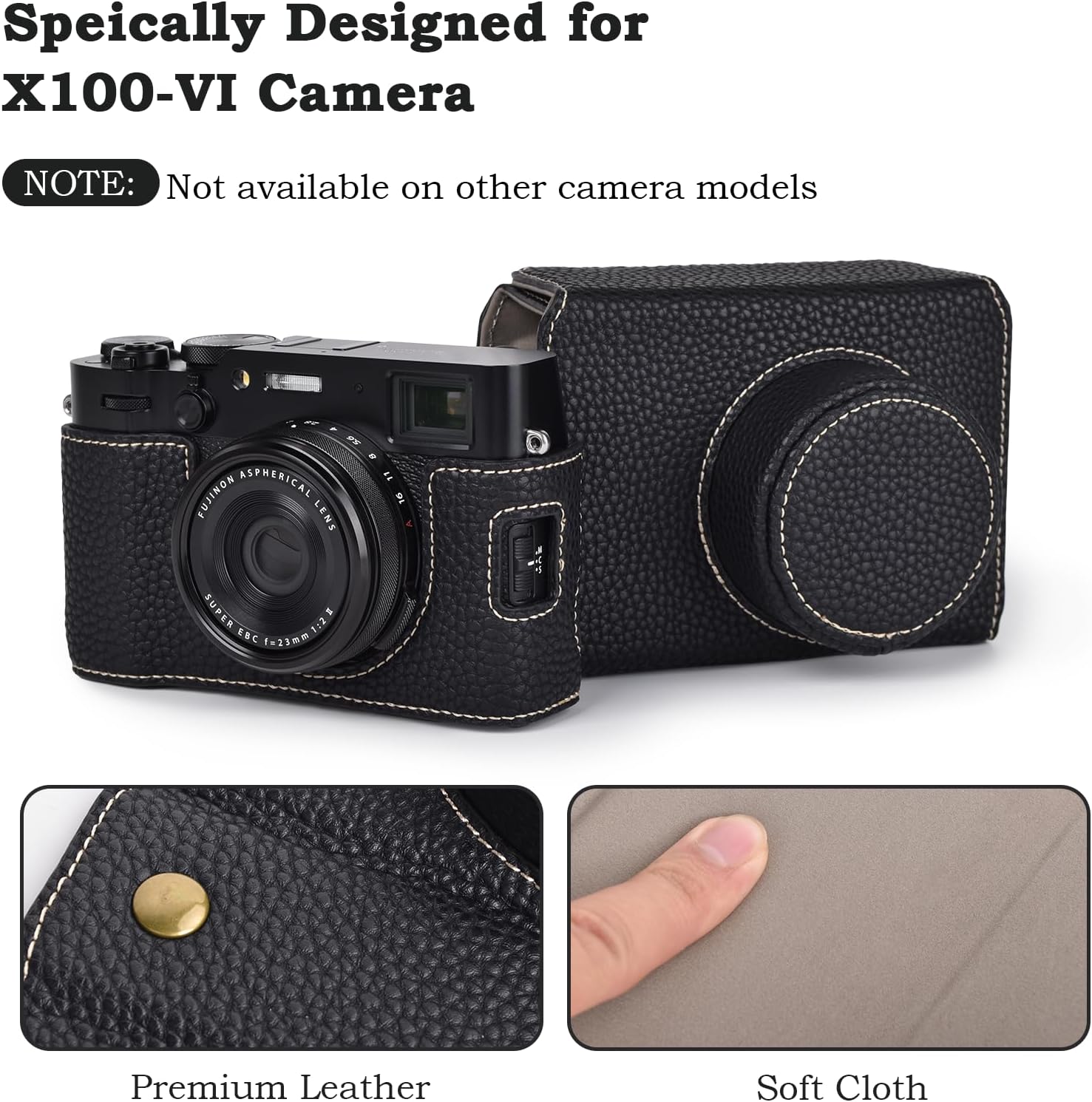 This camera case is suitable for the Fujifilm x100vi camera. It is made of high-quality PU leather, providing perfect protection for the camera and is also convenient to carry.The package includes a detachable protective case (half case + outer shell), an adjustable camera strap, and a 1/4 screw.(Not include the camera and the small metal ring that connects the camera to the shoulder strap)
