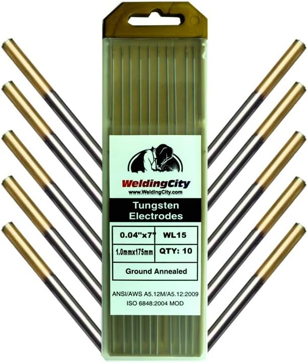 Box of 10-pcs premium TIG welding Tungsten electrodes 1.5% Lanthanated. AWS Classification: EW-La15 (Gold). Conform to ANSI/AWS Standard A5.12M/A5.12:2009 ISO 6848:2004 MOD. Extended current range on DC. Good DC arc starts and stability. Low spitting. Reduced burn-off erosion. Available Tungsten electrode diameters: 0.040" (0.5mm), 1/16" (1.6mm), 3/32" (2.4mm), 1/8" (3.2mm) and 5/32" (4.0mm); 7" (176mm) length. Ground annealed. 10-pcs/box Tungsten electrodes (1.5% Lanthanated EW-La15)