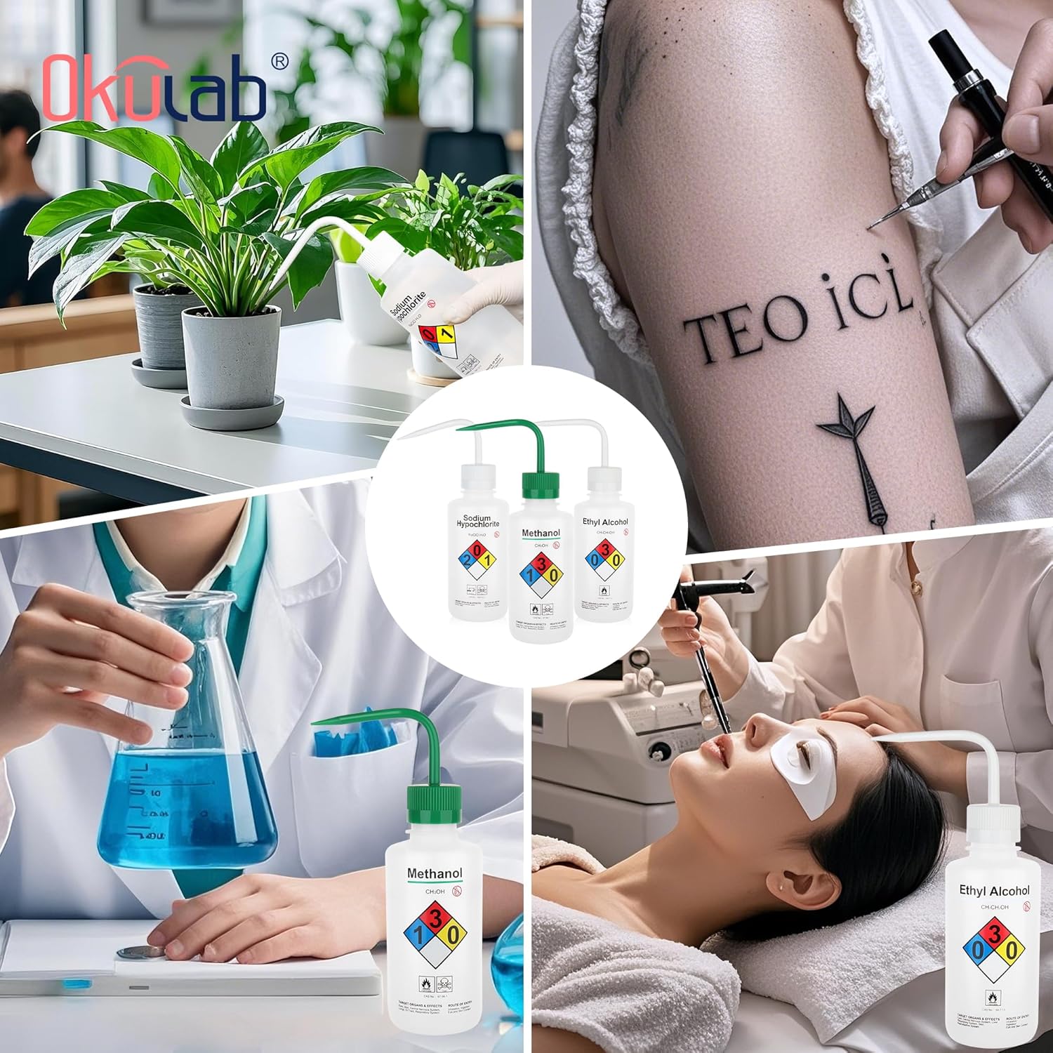 Capacity:Vol. 500ml, 4pcs per set narrow mouth wash bottles. Premium Material: Made of LDPE material, construction with long lasting strength. Rebound is sensitive and won't stiffen with extended use. Superior Design: The long dispenser tube allows for cleaning of areas that would normally be difficult to reach. Easy to Clean: Simply unscrew the cap and rinse it off. Wide Application – The wash bottles squeeze can be used as lab wash bottles to wash labware, or as tattoo water bottles to clean body tattoo. Convenient tool for tattooist, lab stuff, barber etc.