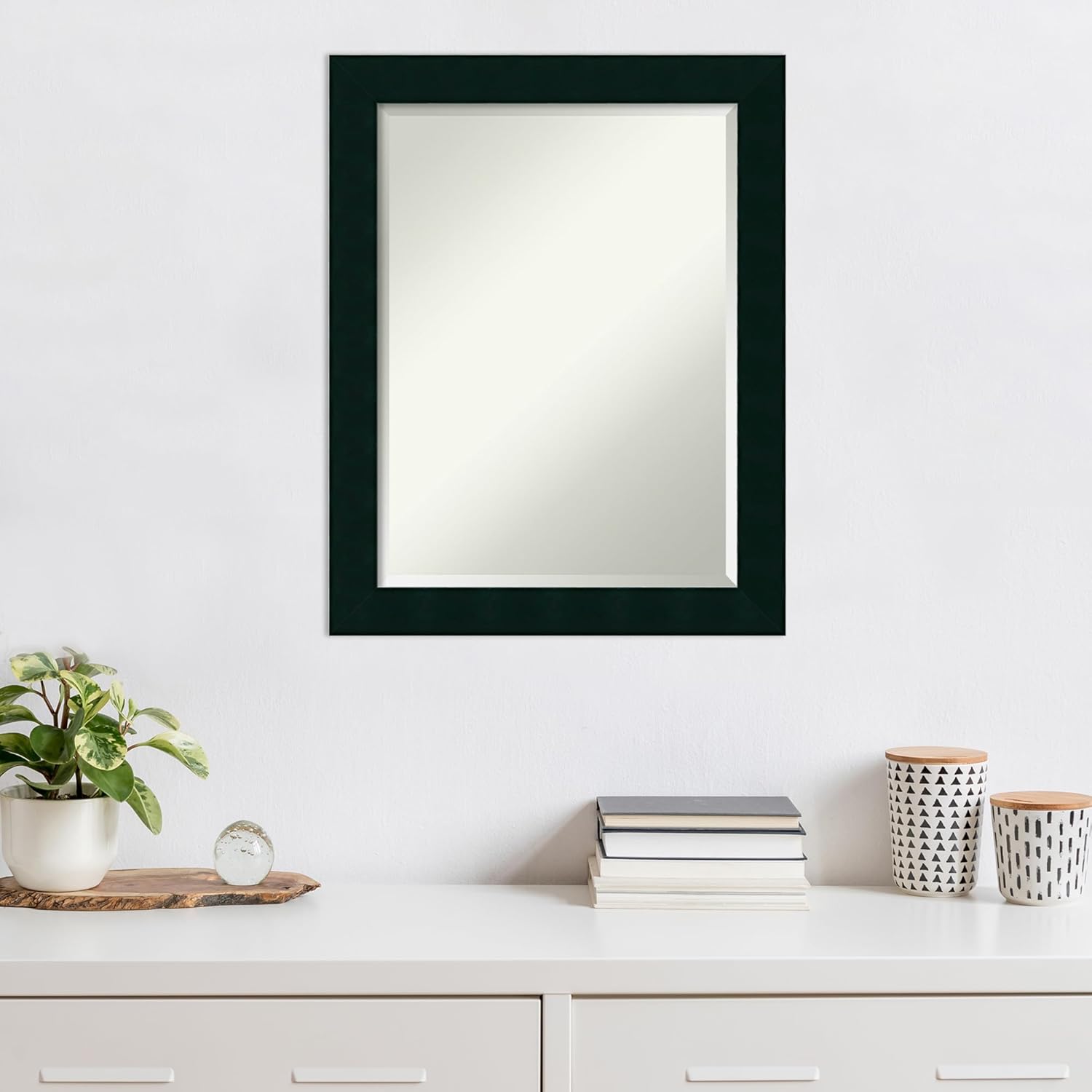 PRODUCT: Amanti Art Beveled Wood Wall Mirror; OUTER SIZE: Exactly 22.25 x 28.25 inches; FRAME: Tribeca Black; FRAME FINISH: Distressed; FRAME COLOR: Black. The Tribeca Black frame is an impressive, chunky black frame with a matte surface. Give your home or office the finishing touch with this 100% real wood-framed wall mirror. Individually made using traditional custom framing techniques, it has the quality you would expect from your local frame shop. It holds its value with premium finishing that can be appreciated up close. Because of our attention to detail and focus on artistry, architects, interior designers, and homeowners alike choose this mirror to create beautiful living spaces.