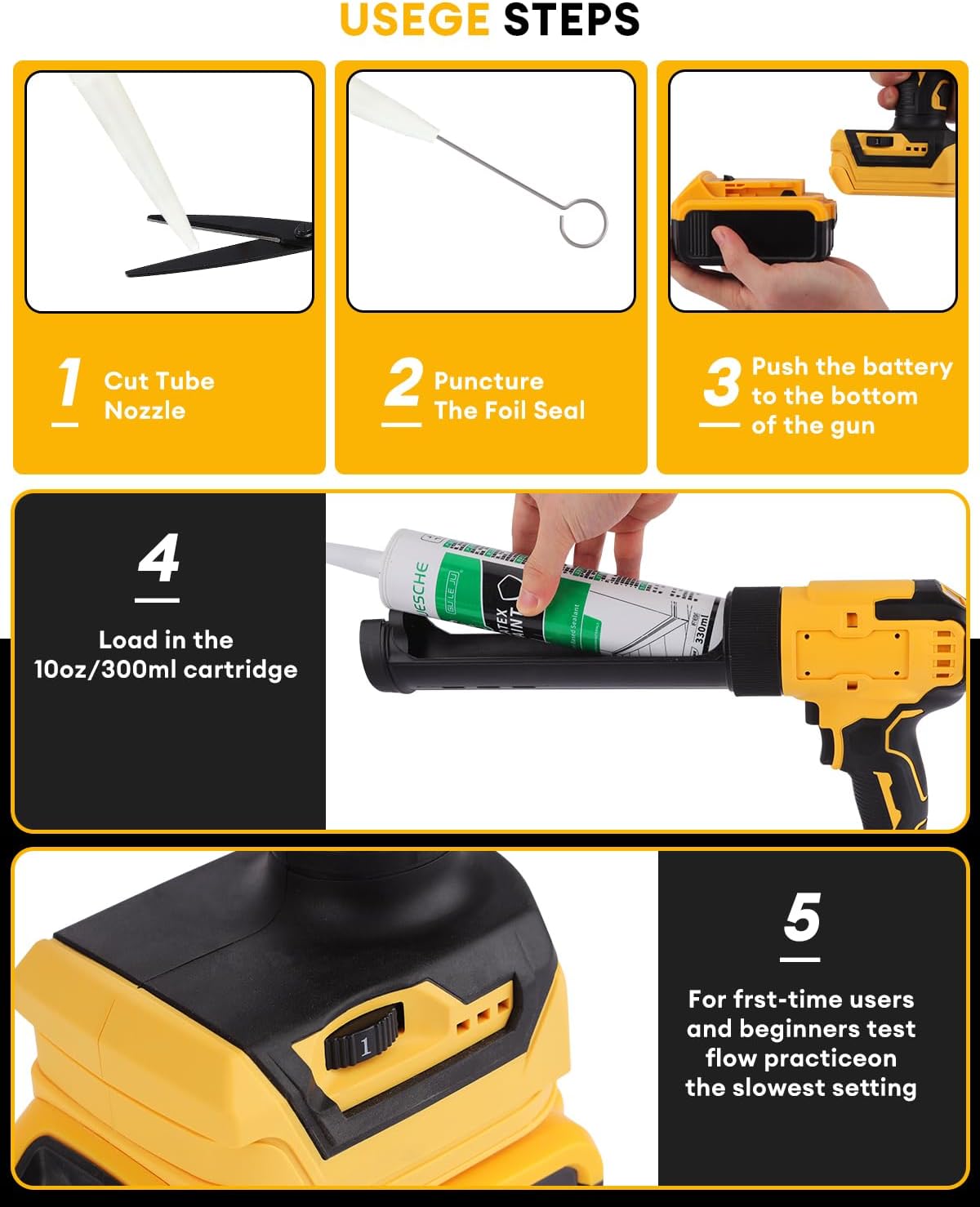 | Included Components | 1*Cordless electric caulking gun, 5-piece Scraper Set, 1*Rubber scraper,1*Through Needle, 1*User Manual |