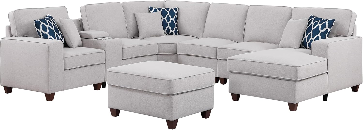 This modular sofa-and-chaise sectional comes with 2 ottomans to complete your glam living room, each piece can be rearrange the location in order It's crafted with a frame that rests on block legs, wrapped in a refined linen blend in a neutral hue and comes with 4 matching color toss pillow The foam-filled cushions give you just the right amount of support, paired with the plush pillow back – each cushion is removable for easy vacuuming this sectional is also very easy to assemble them together only required the mininal assembly steps