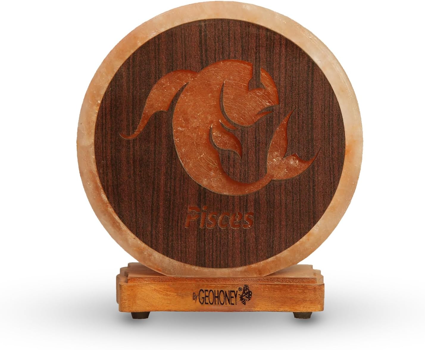 Illuminate your space with this stunning Pisces zodiac-themed Himalayan salt lamp by GEOHONEY. This beautifully crafted lamp features an artistic representation of the Pisces fish symbol carved into natural Himalayan salt, creating a mesmerizing amber glow when lit. Standing 9 inches tall and weighing approximately 13.2 pounds, this substantial piece sits atop a sturdy wooden base with the GEOHONEY signature mark. The circular design measures about 7.9 inches in length and 4 inches in width, making it a perfect decorative accent for any room. The warm, soothing glow creates an enchanting atmosphere while serving as a unique conversation piece. The natural variations in the salt crystal ensure that each lamp is one-of-a-kind, with subtle differences in color and pattern. This lamp makes an especially meaningful gift for those born under the Pisces zodiac sign or anyone who appreciates distinctive home decor. The wooden base provides stable support while complementing the natural beauty of the salt crystal.