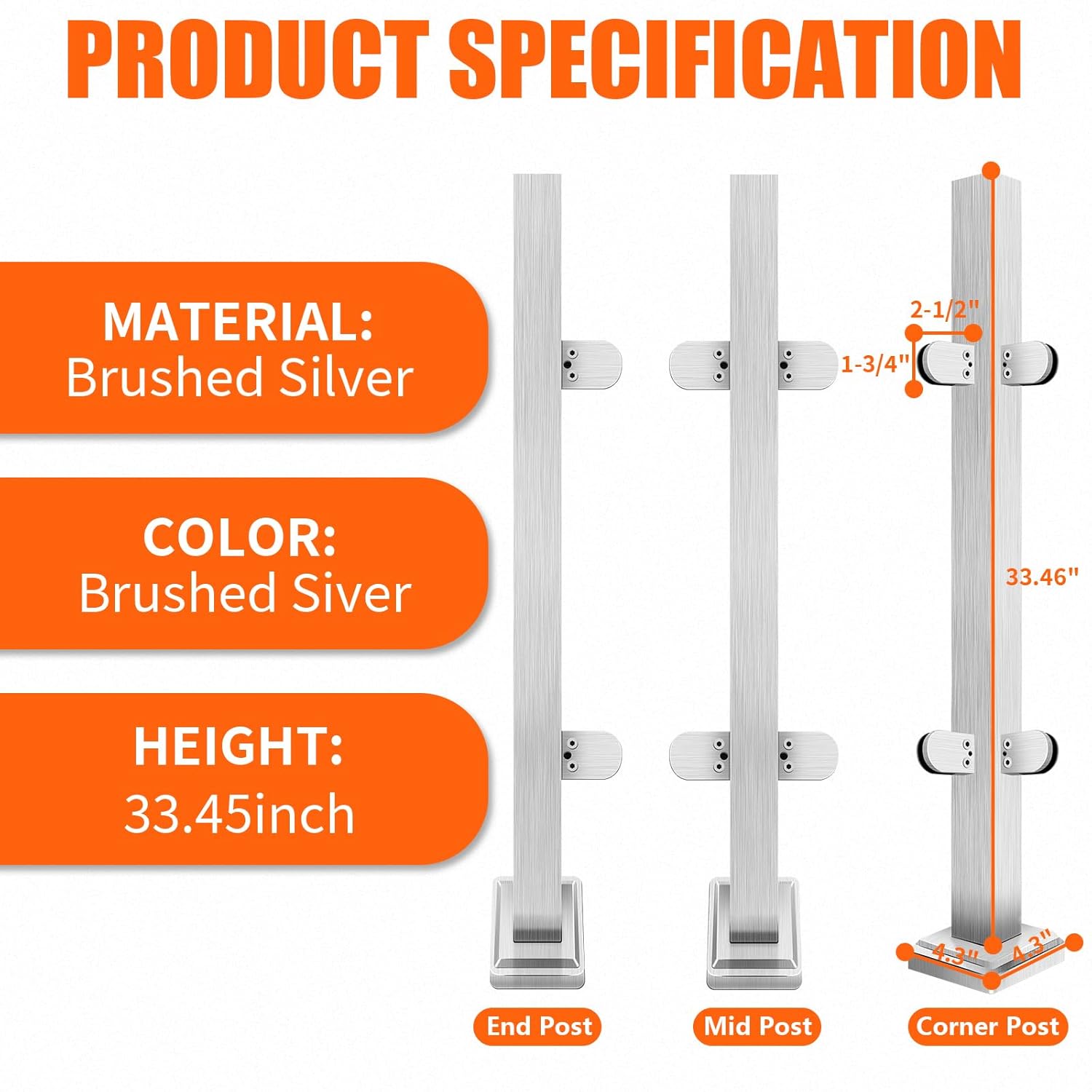 Advantages and Benefits of Glass Armrest ColumnsWhen installing glass handrail posts, you can enjoy the following benefits:1. Transparent and beautiful: it can provide a clear view without blocking light, increasing the sense of transparency and aesthetics.2. Safe and durable: It has high strength and durability, can withstand pressure and impact, and ensures the safety of users.3. Easy to clean and maintain: smooth and flat, not easy to accumulate dust, not subject to corrosion or fading, and low maintenance cost.4. Sense of space and transparency: increase the sense of spaciousness, coordinate with decorative elements, and create a modern and fashionable atmosphere.Specifications:Brand: ITEVE.GDProduct Name: Glass Railing PostModel: End / Middle / Corner PostMaterial: 304 Stainless SteelSurface Technology: SandingHeight: 33.46inFeature: Wear and Rust ResistanceApplicable: Scenarios Balconies, Stairs, Gardens, Terraces, Fences, etc.