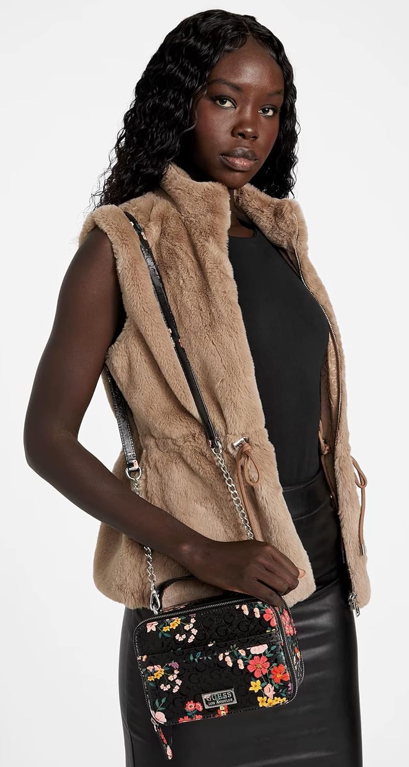 Have a mini moment with this crossbody featuring a G-shine logo and floral print, double zip-top closure, top handle, logo plaque and removable strap.