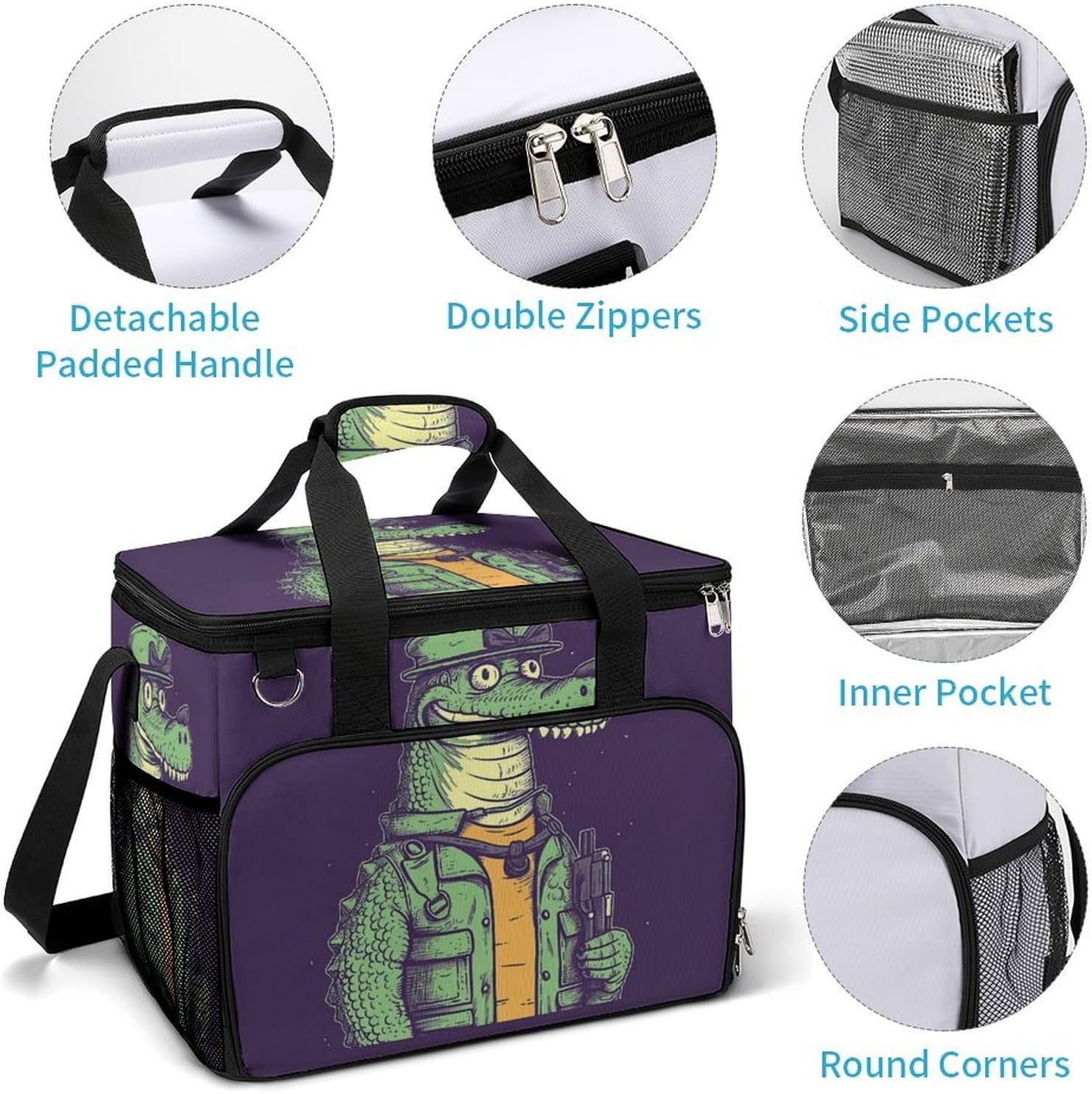 Take Your Meals Anywhere with Crocodile Holding Gun Grocery BagsFood Container Carrier Oxford Fabric Picnic Bag Heat Retaining Food Bag Camping Cooler BBQ Accessories Cute Picnic Bag with Pockets Insulated Food Bag for Work Insulated Lunch Tote Bag Camping BagTemperature Control That WorksThe upgraded aluminum foil lining creates an effective thermal barrier. Your drinks stay refreshingly cold, and your hot dishes maintain their warmth for hours. No more lukewarm meals during outdoor outings.Thoughtful Storage DesignTwo side mesh pockets - Perfect for water bottles or umbrellasFront zippered pocket - Keeps keys, phone, or condiments organizedInternal mesh pocket - Stores utensils, napkins, and small essentialsMain compartment - Spacious enough for food containers and snacksBuilt for Daily AdventuresConstructed from high-density oxford fabric with reinforced stitching at stress points. The double zippers are sturdy and smooth-operating. Reinforced handles let you carry heavy loads with confidence.Carry Your WayHandles for quick grabbingStands upright for easy packing and accessPerfect For:Picnics in the parkBeach days and pool partiesCamping and hiking tripsOutdoor concerts and festivalsDaily work lunchesGym and fitness classesRoad trips and travelGrocery shoppingSpecifications:Dimensions: 15.4 x 11.8 x 11.8 inchesMaterial: High-density Oxford fabricLining: Aluminum foil (insulated)Closure: Sturdy double zippersPockets: 2 side mesh, 1 front zipper, 1 internal meshCare: Hand wash or machine wash, do not bleachNote: Food containers and utensils shown in images are not included.