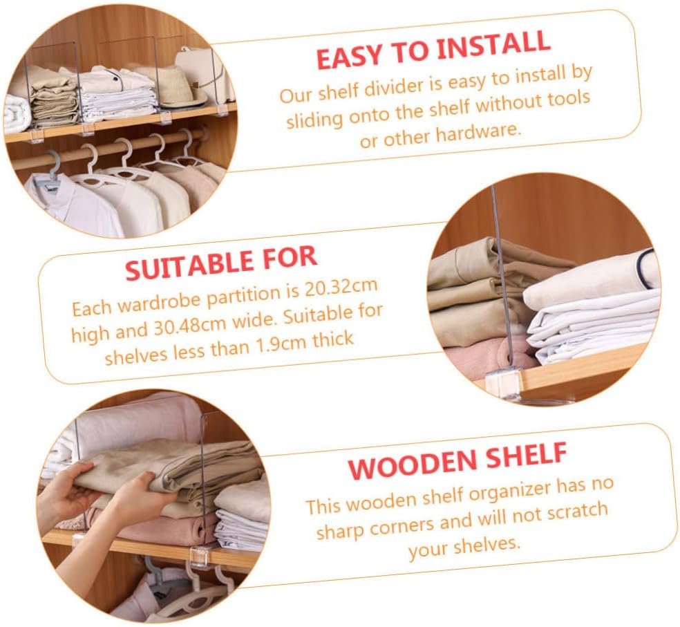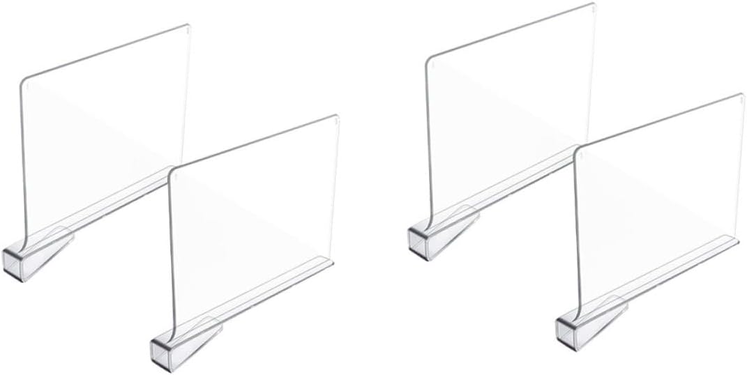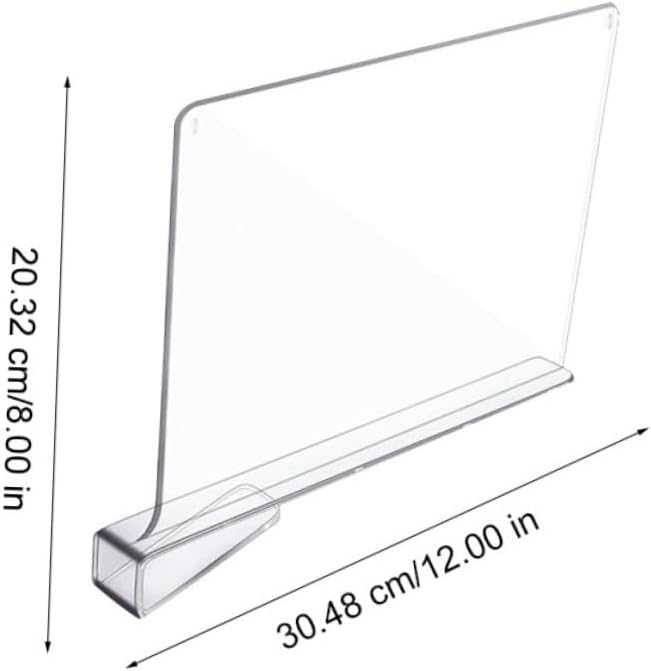 Package List 4 x Shelf Dividers Characteristics -Material: Acrylic -Color: Transparent -Size: 30.48X20.50X3.00cm/11.98X8.06X1.18in -Product Info:Wardrobe partition -Separate shoes, purses and bags on the same shelf and still have a neat appearance Divider for Goods Rack. -It is manufactured with professional technology to ensure the of the product and can work for a long time. clear closet dividers -Made of premium acrylic material, with high transparency, crystal clear and slender appearance. -The stylish shelf divider allows you to separate the large shelves and easily stack items such as clothing, towels, blankets and linen into neatly stacked piles to increase storage space. wardrobe divider -Suitable for wardrobe, kitchen, office storage to maximize closet storage space Transparent Closet Dividers.Goods Informationwardrobe dividers for clothes Not just for your closet, shelf dividers are also perfect for your kitchen cupboards or pantries to keep food separated and organized.cabinet dividers And more besides, you can also use it in the office to tidy up notebooks, binders or books.clear dividers for shelves Use craft rooms to keep supplies in their place