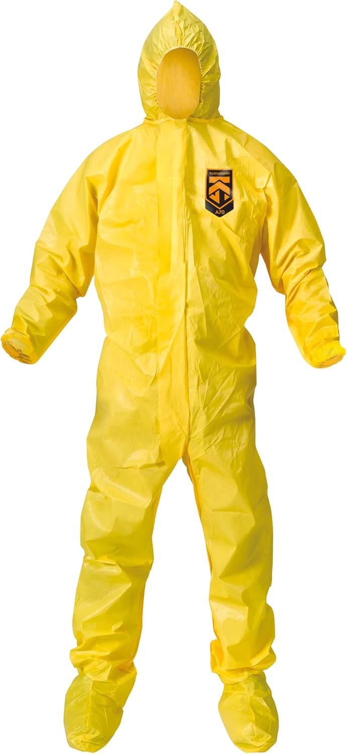 If you – or your employees – are working in an environment where liquid and dry chemicals are present, you need the right protection equipment. You can trust the Kleenguard A70 Chemical Spray Protection Coveralls for comfort and protection. The Kleenguard A70 protective garments are made of a 1.5 mil polyethylene-coated fabric, which is resistant to many water-based liquids, greases and oils and liquid chemical splashes. They feature a wick-away lining for enhanced comfort, a liquid-resistant, extra-long zipper and a taped, sealable zipper flap. The seamless front gives the wearer more protection in the primary exposure area, and the REFLEX Coverall Design offers excellent fit and freedom of movement. This model comes with a hood and boots, zipper front (with storm flap), and elastic wrists.