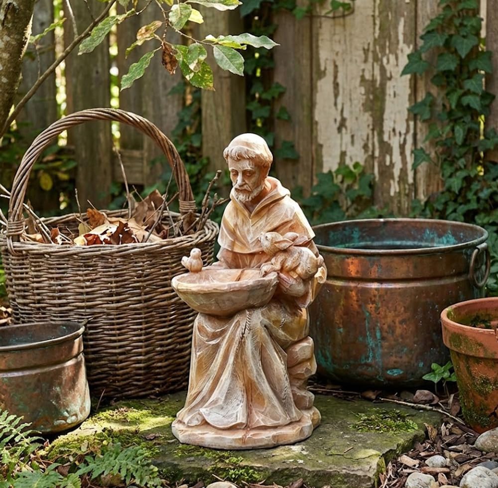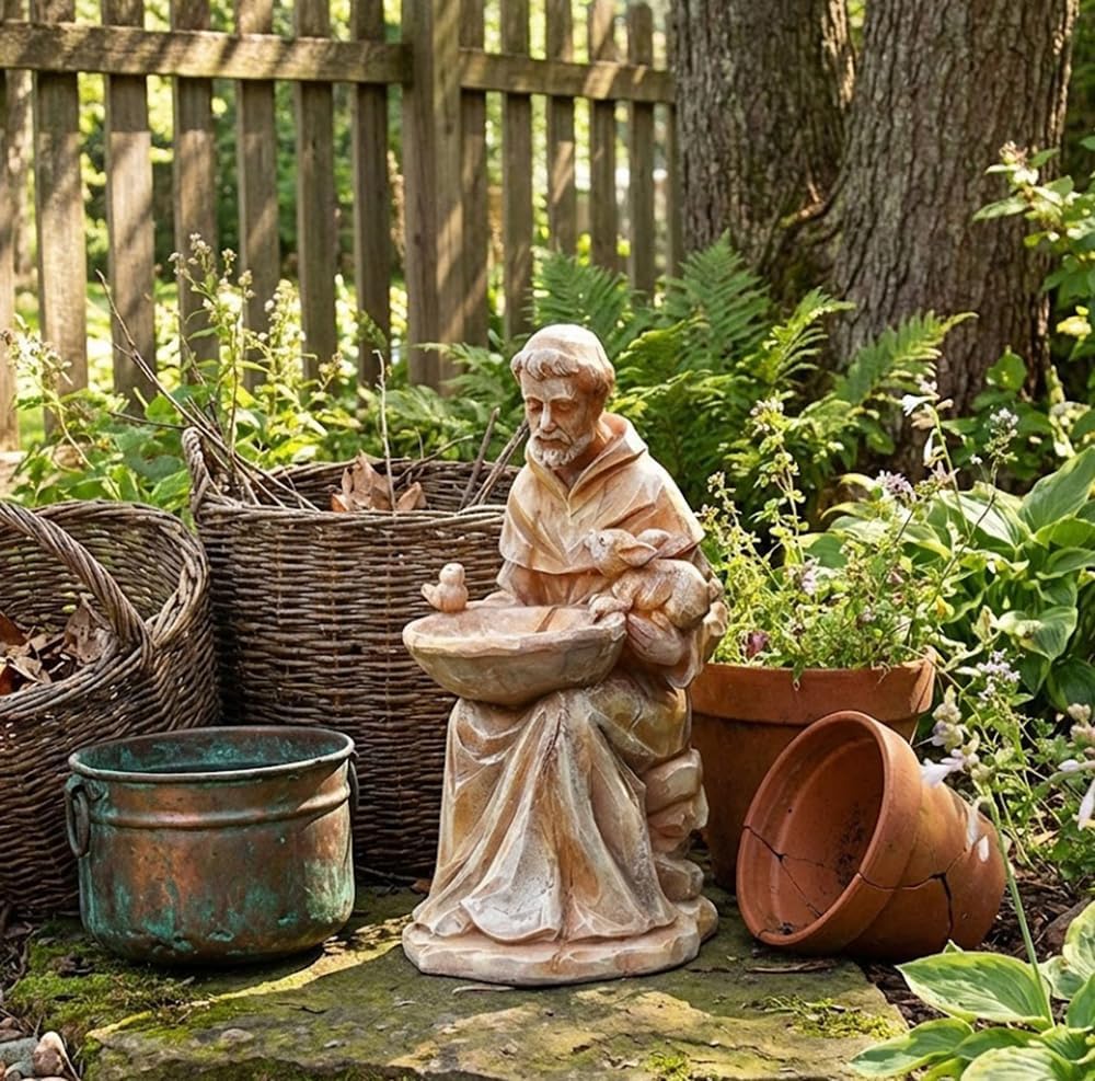 Create a more peaceful garden with this light brown statue of St. Francis of Assisi sitting with animals and a bowl in his lap. Sprinkle bird seed into the bowl to attract wildlife. Made of quality resin for durability and long lasting beauty indoors or out. Known for his humble nature and love of and connection with all creatures great and small, St. Francis of Assisi, the patron saint of animals, still serves as an inspiration to followers and those with a love for animals and ecology. With a uniquely innovative in-house design team focusing on design, quality and value, Napco offers a wide range of seasonal designs, garden living, inspirational assortments and collections to help add functional decor to your outdoor spaces. We strive to bring wonderful, whimsical and inspirational products to the market, as we have done for over 70 years. We truly are your one-stop-shopping home for all your floral, garden, gift and seasonal decor needs.