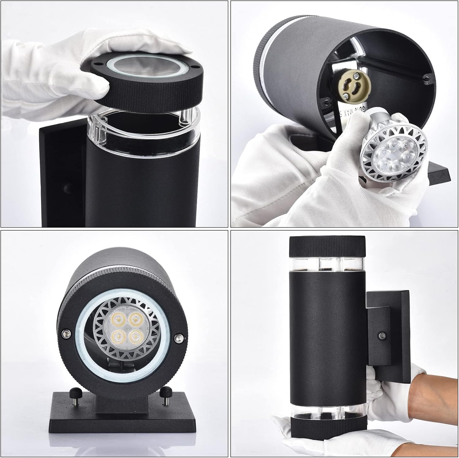 An Elegant Matte Black Die-casting Aluminum Soft White Wall Sconce for your modern Home Decor - By BLING This BLING Modern Outdoor Wall Sconce will evenly distribute light both upwards and downwards. Light up your walkway, porch, backyard, Patio or poolside garden decor. Features: * 2 PCS up and down light bulbs are included in this exterior light fixture, Type of LED GU10 light bulbs with ETL listed . * Made of Die-casting Aluminum, up down screw lids with silicone gasket sealed, Tempered glass diffuser. * Waterproof IP54, Weather-resistant & Rust-resistant.It is waterproof in common rain and dust. *Dust-protected and protected from moisture assault as strong as splashing water. *Smart LED wall light Save 80% energy than common bulb Specification: * Outdoor fixture ETL Listed, US and Canadian standards for your safety, and CE,RoHs Listed also. * Dimension: Dia.4.3", Height 9.6", Back Plate: 4.3" * 4.3". * Lamp socket: GU10 , UL Listed. * Input Voltage:AC100-240V. 60HZ * Material:Die-cast aluminum+PMMA lens * Flux lumen :1000lm(White 500lmx2) * CRI > 80 PF:0.95 * Lifespan:30,000 Hours * Beam Angle:38 degree * Light source type:5W GU10x 2 (5Watt Led Equivalent 50W x 2 ) Innovative Fashionable Design & Waterproof IP54 This wall send light form both the top and bottom of its square shape to light up your home.the light adapt to kinds of weather even in the rain,Cause its great waterproof rating and professional design, making it reliable for daily use. Definitely shines up and down, The light wash highlights the architecture well, Made your mid century modern home more beautiful. Package include: 2 x Double Up & Down wall light fixture 4 x 5W Warm White GU10 Spotlight