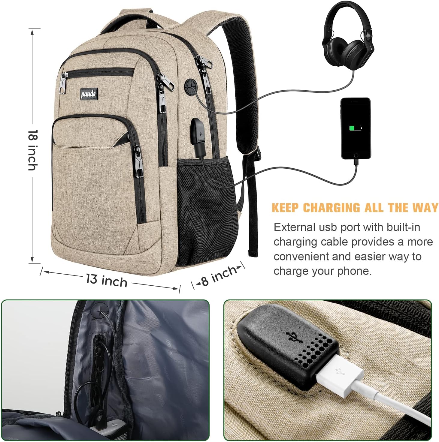 Features 1.The S-shaped shoulder strap is ergonomic to protect your shoulders and spine. 2.Pencil pocket,many zipper pockets,and a key hanger inside, which are fully functional. 3.A special pocket for storing powerbank inside, which will not be disconnected during bumps. 4.Waterproof resistant, scratch resistant, water repellent, but please don't let the backpack "bathe" in heavy rain.Bag's size and fit guide 15.6 inch bookbag is ideal for people of height from 4.5ft to 6.25ft. 17.3 inch bookbag is ideal for people of height from 5.3ft to 6.4ft. Suitable for a variety of Occasion College Backpack,high school backpack,middle school backpack Business backpack,computer backpack,laptop backpack,office backpack,travel backpack Specifications Size:18 X 13 X 8 inch Capacity:35L Weight:1.8lbs Gender:Unisex Closure Type:Metal Zipper Material:Waterproof Polyester Style:Laptop/School/Business/Travel Laptop Compartment:13inch,14inch,15inch,15.6inch,16inch Package Include Backpack x 1 Usb cable x 1