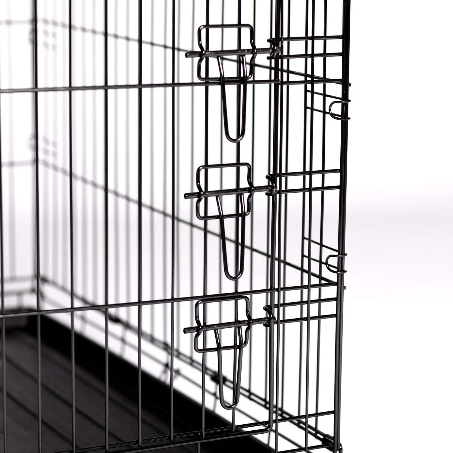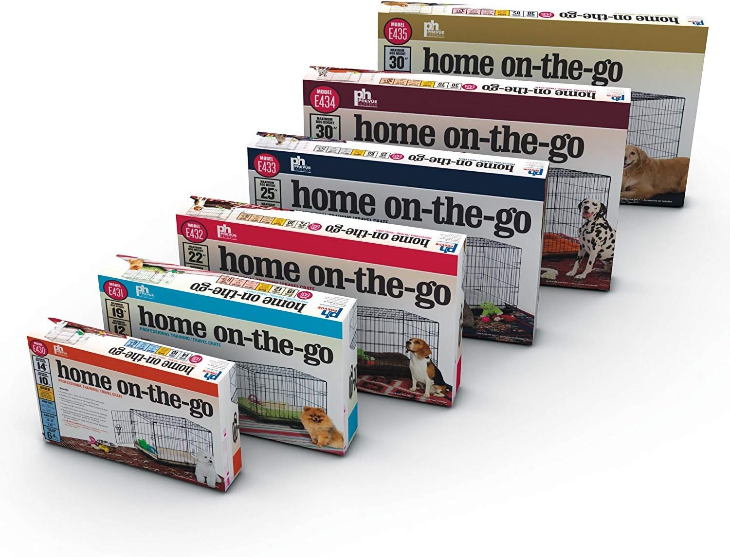 Prevue Pet Products Home On-The-Go Single Door Dog Crate Large E434 has been created to provide your pet with the highest level of safety and comfort. Designed to withstand years of use, our Economy Dog Crate features an innovative injection-molded plastic pan which is stronger than other plastics and will not warp. Extra deep 1-1/2-inch plastic pan with rounded corners prevent leaks while elevated grooved portions of the pan keep your pup above any mess. Minimal space between the pan and cage, plus an independent pan lock, mean the pan won't be pushed out, but can be easily removed for quick cleaning. Constructed from heavy gauge mesh for security and stability, the large front door features a heavier framework plus 3 security locks, strategically placed near the perimeter to provide maximum security. Lightweight, single door crate features a non-toxic, durable, powder-coated black finish, assembles easily without tools, has plastic handles for portability and folds flat when not in use. Whether used for training or traveling our wire crate provides your pet with unobstructed views and better air ventilation than plastic kennels and won't leak or stain like galvanized steel. Our Large Economy Dog Crate is ideal for pets up to 70-pound. and 30-inch in height, such as Dalmatians, American Bulldogs, Siberian Huskies and Irish Setters. Crate measures 42-inch Long, 28-1/2-inch Wide and 32-inch High while open and folds flat to 42-3/4-inch Long, 29-1/2-inch Wide and 4-inch High. Constructed from 5, 7 and 9 gauge mesh with 1-1/2-inch wire spacing.