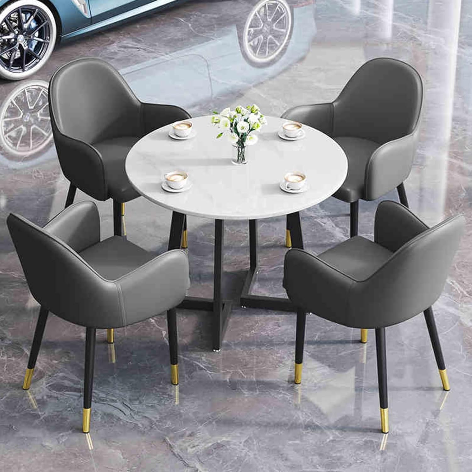 Product Name: Table and chair combinationColor Options: Light gray+gray, Orange+gray, Blue+gray, GrayFeatures: Simple, generous, space-saving designStyle: Simple and modernBracket Structure Material: Carbon SteelTable Shape: RoundDesk Top Material: Rock slabsTable Top Diameter Options: 80cm/31.4in, 90cm/35.4inTotal Chair Height: 82cm/32.2inApplicable Scenes: Office, coffee shop, tea shop, reception, restaurant, library, cinema, clothing store, maternal and child shop, living room, etc.Applicable Number: Suitable for 4 peoplePacking Method: Assembly requiredPacking List: 1*table, 4*chairs (decorations not included)️ Warm Tips:1. Size Description: Product measurements are done by hand and may have an error of 1-3 cm. Please refer to the received items for accurate sizing.2. Picture Description: Product images are real but due to lighting, angle, and display differences, slight color variations may occur. Thank you for your understanding.