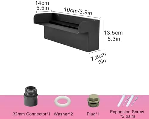 **Key Benefits:**1. **Rust-Resistant Design:** Our advanced powder spraying technology offers superior rust resistance, ensuring long-lasting beauty and functionality.2. **Durable Stainless Steel:** Crafted from high-quality stainless steel, this spillway is built to withstand the elements and provide enduring performance.3. **Hassle-Free Installation:** The user-friendly installation process allows for quick setup, so you can enjoy your new water feature in no time.4. **Natural Water Flow:** Experience the calming effect of a natural waterfall with smooth water flow that enhances the ambiance of your outdoor environment.**Product Specifications:**- **Material:** Stainless steel- **Color:** Black- **Size Options:** Choose from various lengths: 10cm, 15cm, 20cm, 30cm, 40cm, 50cm, 60cm, 80cm, 90cm, and 100cm (with a width of 14cm and height of 13.5cm). Connector inner diameter is 32mm.**Package Includes:**- 1 x Stainless Steel Fountain- 1 x Connector- 2 x Washers- 1 x Plug- 2 pairs of Expansion Screws