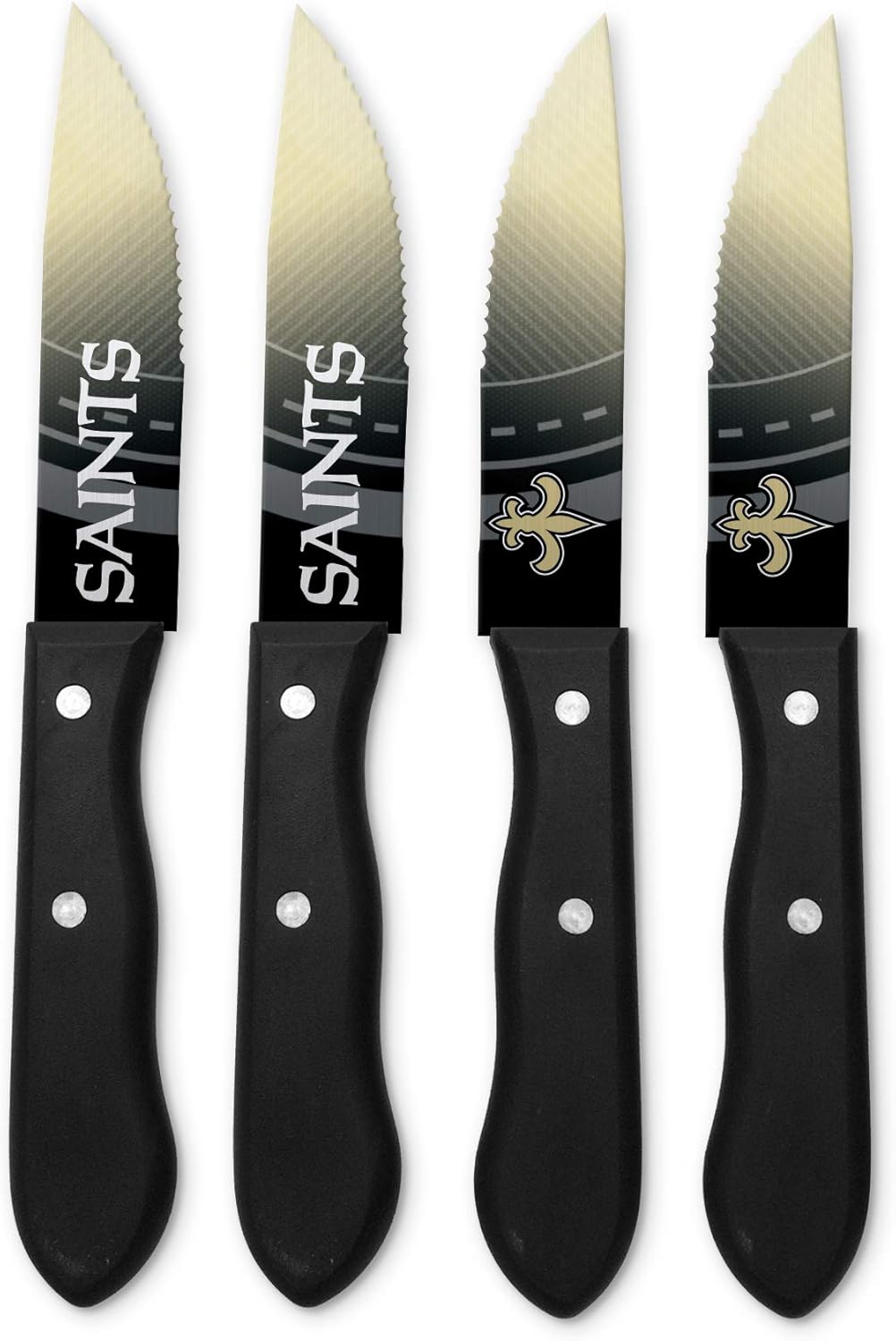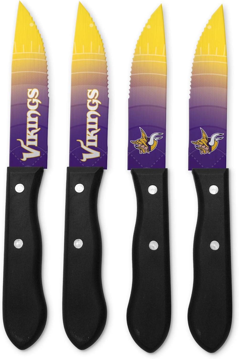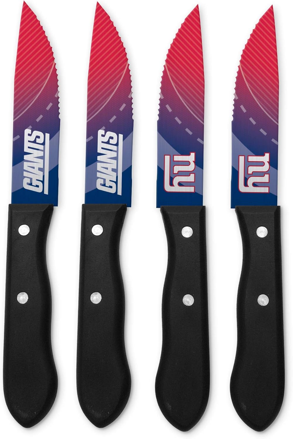 That first cut into a juicy steak that's cooked perfectly medium rare and that initial bite of flavor goodness. Mmmmmmm!!! Now you can experience all of that meaty goodness while supporting your favorite team with this set of 4 serrated stainless steel steak knives from The Sports Vault. Each knife is approximately 9.5-Inches long with a 5-Inch blade and features custom team artwork on each side. You don't win friends with salad but these knives will surely lend yourself to moving up the ranks with your friends and family. Perfect for homegating, tailgating or bbq's and to celebrate your game night victory